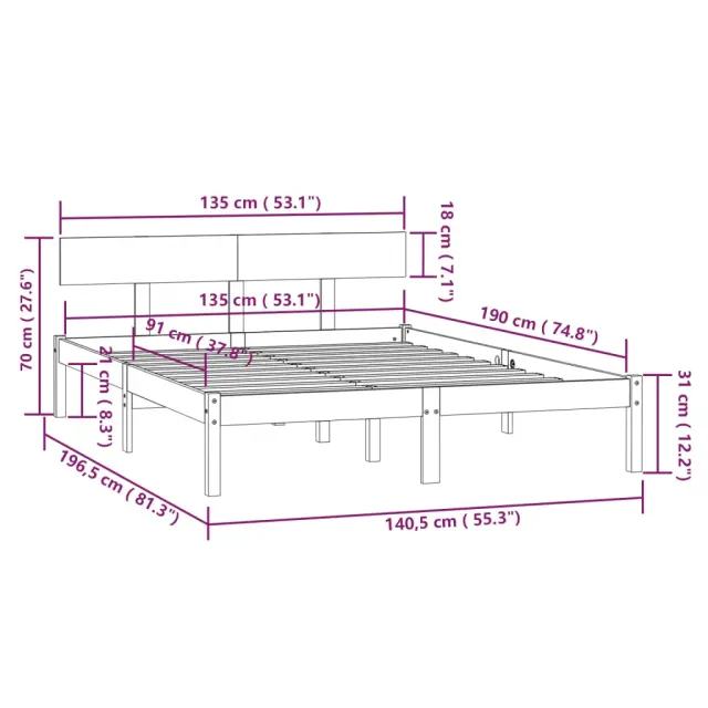 Ustvarite moderno spalnico s tem lesenim posteljnim okvirjem! To je praktičen in dekorativen dodatek za vaše notranje prostore. Podnožje je izdelano iz trdne borovine ter je zelo močno in vzdržljivo. Močne letvice ponujajo potrebno podporo, klasično vzglavje pa omogoča udobno počivanje med branjem ali gledanjem filma. Ta postelja velikosti UK double je primerna za vzmetnico 135x190 cm (4FT6 Double). Na tej postelji lahko vsako noč uživate v odličnem spancu! Opomba: Paket vsebuje samo posteljni okvir. Vzmetnica ni priložena.Barva: BelaMaterial: Trdna borovinaDimenzije: 196,5 x 140,5 x 70 cm (D x Š x V)Velikost primerne vzmetnice: 135 x 190 cm (Š x D) (vzmetnica ni priložena)Z vzglavjemPotrebno sestavljanje: Da