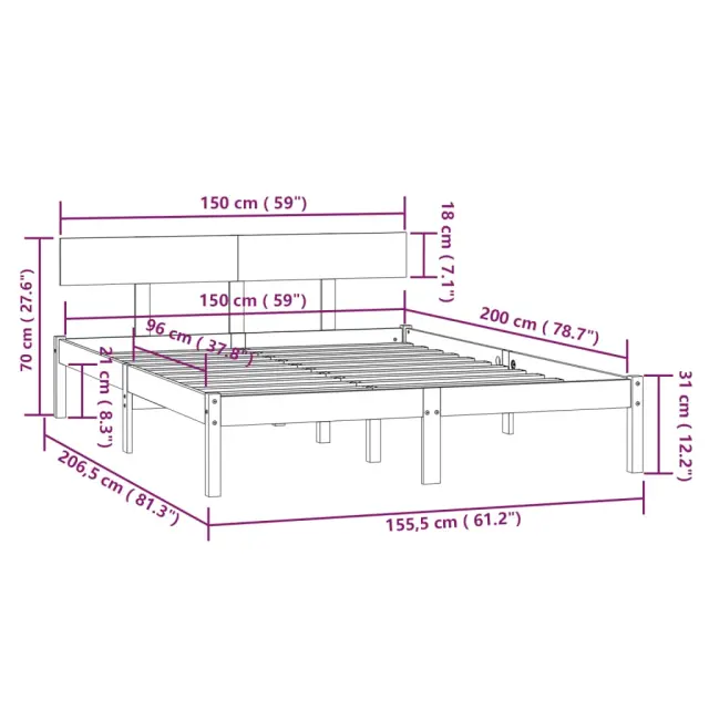 Ustvarite moderno spalnico s tem lesenim posteljnim okvirjem! To je praktičen in dekorativen dodatek za vaše notranje prostore. Podnožje je izdelano iz trdne borovine ter je zelo močno in vzdržljivo. Močne letvice ponujajo potrebno podporo, klasično vzglavje pa omogoča udobno počivanje med branjem ali gledanjem filma. Ta zakonska postelja je primerna za vzmetnico 150x200 cm (5FT King Size). Na tej postelji lahko vsako noč uživate v odličnem spancu! Opomba: Paket vsebuje samo posteljni okvir. Vzmetnica ni priložena.Material: Trdna borovina (neobdelana)Dimenzije: 206,5 x 155,5 x 70 cm (D x Š x V)Velikost primerne vzmetnice: 150 x 200 cm (Š x D) (vzmetnica ni priložena)Z vzglavjemPotrebno sestavljanje: Da