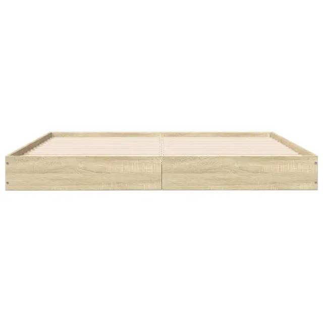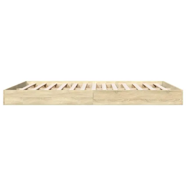 Zagotovite si boljši spanec s tem posteljnim okvirjem! Je prijeten dodatek za vsako spalnico. Vzdržljiv material: Inženirski les se ponaša z izjemno kakovostjo, gladko površino ter močjo, stabilnostjo in odpornostjo na vlago. Trdne letvice: Letvice iz vezanega lesa omogočajo dobro porazdelitev teže in zagotavljajo, da vzmetnica ostane na mestu ob vsakem zasuku in obračanju med spanjem. Moderna zasnova: Svojim notranjim prostorom dodajte moderen stil! Moderen stil notranjih prostorov vključuje čiste linije, minimalističen videz in naravno svetlobo. Dobro je vedeti:Vzmetnica ni priložena tej postelji. Ponujamo različno izbiro ležišč. V naši trgovini si lahko ogledate ustrezne vzmetnice.Barva: Sonoma hrastMaterial posteljnega okvirja: Inženirski lesMaterial letvic: Vezan lesCelotne dimenzije: 203 x 163 x 17 cm (D x Š x V)Velikost primerne vzmetnice: 160 x 200 cm (Š x D) (vzmetnica ni priložena)Potrebno sestavljanje: Da