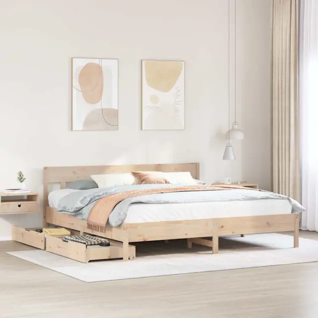 Zagotovite si boljši spanec s tem posteljnim okvirjem! Je prijeten dodatek za vsako spalnico. Stabilen in dolgotrajen okvir: Trdna borovina je znana po svoji trdnosti in trajnosti. Ravni vzorci in značilni vozli prispevajo k njenemu rustikalnemu čaru.Podnožje z letvami za optimalno podporo: Za podporo in zračnost ležišča je posteljni okvir opremljen z letvenim dnom.Vsestransko vzglavje: Ta posteljni okvir je opremljen z vzglavjem, ki zagotavlja odlično oporo hrbtu, ko sedite v postelji in berete ali gledate televizijo, hkrati pa služi tudi kot dekorativni element.Popolnoma izkoriščen prostor: Ta posteljni okvir ima spodaj dva predala, ki omogočata shranjevanje predmetov, kot so dodatna posteljnina, sezonska oblačila in igrače.Preprosto manevriranje: Ta predal za shranjevanje pod posteljo ima štiri kolesa, ki zagotavljajo gladko in lahkotno manevriranje pri drsenju pod posteljo in izpod nje. Dobro je vedeti:Vzmetnica ni priložena tej postelji. Ponujamo različno izbiro ležišč. V naši trgovini si lahko ogledate ustrezne vzmetnice.Potrebno sestavljanje: DaPosteljni okvir z vzglavjem:Material: Trdna borovina (neobdelana)Material letvic: Vezan lesDimenzije: 205,5 x 185,5 x 81 cm (D x Š x V)Velikost primerne vzmetnice: 180 x 200 cm (Š x D) (vzmetnica ni priložena)Predal:Material: Trdna borovina (neobdelana)Zunanje dimenzije: 95 x 55 x 16 cm (Š x G x V)Notranje dimenzije: 86,5 x 52,5 x 10 cm (Š x G x V)Maks. nosilnost (vsaka): 20 kgS štirimi kolesiPaket vsebuje:1 x Posteljni okvir z vzglavjem2 x Predal