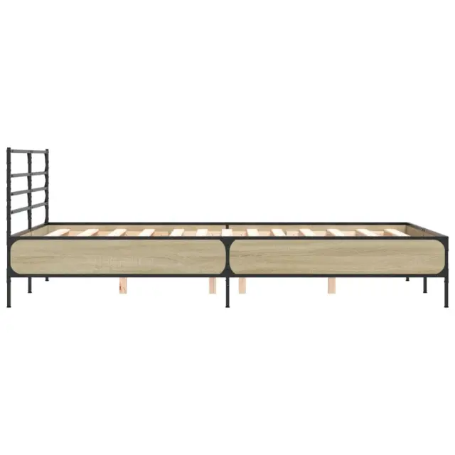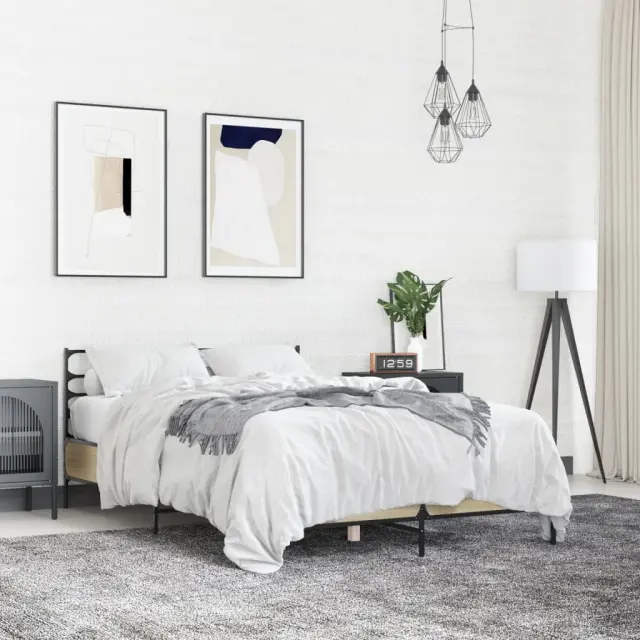 Zagotovite si boljši spanec s tem posteljnim okvirjem! Je prijeten dodatek za vsako spalnico. Vzdržljiv material: Inženirski les se ponaša z izjemno kakovostjo, gladko površino ter močjo, stabilnostjo in odpornostjo na vlago. Kovinske noge in letvice iz vezanega lesa: Okvir postelje je opremljen s kovinskimi nogami in letvicami iz vezanega lesa, ki ležišču nudijo potrebno oporo in zračnost.Odlična podpora: Vzglavje zagotavlja odlično oporo hrbtu, ko sedite v postelji in berete ali gledate televizijo. Dobro je vedeti: Vzmetnica ni priložena tej postelji. Ponujamo različno izbiro ležišč. V naši trgovini si lahko ogledate ustrezne vzmetnice.Barva: Sonoma hrastMaterial posteljnega okvirja: Inženirski les, kovinaMaterial letvic: Vezan lesCelotne dimenzije: 203 x 143 x 74 cm (D x Š x V)Velikost primerne vzmetnice: 140 x 200 cm (Š x D) (vzmetnica ni priložena)Potrebno sestavljanje: Da