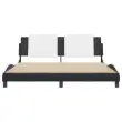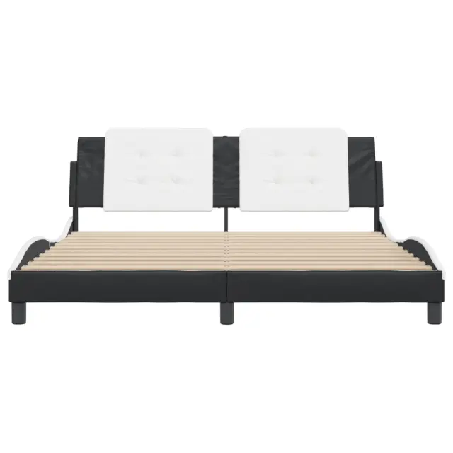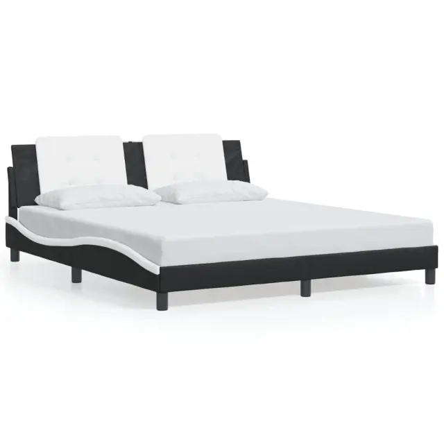 Zagotovite si boljši spanec s tem posteljnim okvirjem z vzglavjem! Je prijeten dodatek za vsako spalnico. Trpežno umetno usnje: Vrhunsko umetno usnje je zelo vzdržljiv material. Je odporno na madeže, zato ga lahko preprosto čistite z vlažno krpo. Gladka površina mu prav tako daje razkošen videz in lepoto pravega usnja.Letvice iz vezanega lesa: Letvice iz vezanega lesa omogočajo dobro porazdelitev teže in zagotavljajo, da vzmetnica ostane na mestu ob vsakem zasuku in obračanju med spanjem.Odlična podpora: Vzglavna stranica je napolnjena s peno za izjemno mehkobo in optimalno udobje ter zagotavlja odlično podporo hrbtu, ko sedite v postelji in berete ali gledate televizijo.Priročna zasnova: Oblazinjeno vzglavje ima zadrgo za enostavno namestitev.Valovita stranica: Valoviti videz posteljnega okvirja je eleganten in prefinjen. Dekorju v vašem domu dodaja sodoben in eleganten pridih ter tako postane osrednja točka spalnice. Dobro je vedeti:Vzmetnica ni priložena tej postelji. Ponujamo različno izbiro ležišč. V naši trgovini si lahko ogledate ustrezne vzmetnice.Posteljni okvir z vzglavjem:Barva: Črna in belaMaterial: Umetno usnje (75 % polivinilklorid, 5 % bombaž, 20 % poliester), kovina, trdna borovina, vezan lesCelotne dimenzije: 218 x 185 x 74,5 cm (D x Š x V)Velikost primerne vzmetnice: 180 x 200 cm (Š x D) (vzmetnica ni priložena)Oblazinjeno vzglavje:Barva: Bela in črnaMaterial: Umetno usnje (75 % polivinilklorid, 5 % bombaž, 20 % poliester)Material polnila: PenaDimenzije: 180 x 3 x 48 cm (D x Š x V)Širina primerne vzmetnice: 180 cmPotrebno sestavljanje: DaPaket vsebuje:1 x Posteljni okvir z vzglavjem1 x Oblazinjeno vzglavje