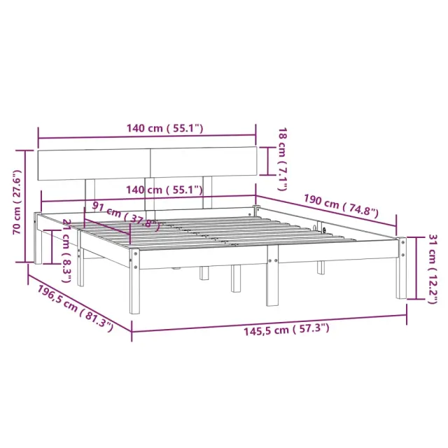 Ustvarite moderno spalnico s tem lesenim posteljnim okvirjem! To je praktičen in dekorativen dodatek za vaše notranje prostore. Podnožje je izdelano iz trdne borovine ter je zelo močno in vzdržljivo. Močne letvice ponujajo potrebno podporo, klasično vzglavje pa omogoča udobno počivanje med branjem ali gledanjem filma. Ta zakonska postelja je primerna za vzmetnico 140x190 cm. Na tej postelji lahko vsako noč uživate v odličnem spancu! Opomba: Paket vsebuje samo posteljni okvir. Vzmetnica ni priložena.Barva: BelaMaterial: Trdna borovinaDimenzije: 196,5 x 145,5 x 70 cm (D x Š x V)Velikost primerne vzmetnice: 140 x 190 cm (Š x D) (vzmetnica ni priložena)Z vzglavjemPotrebno sestavljanje: Da