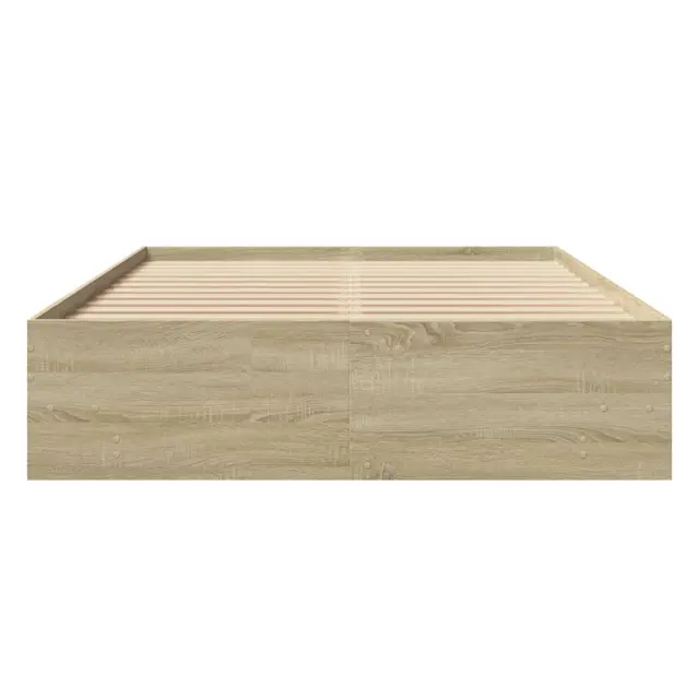 Zagotovite si boljši spanec s tem posteljnim okvirjem! Je prijeten dodatek za vsako spalnico. Vzdržljiv material: Posteljni okvir je izdelan iz inženirskega lesa. Inženirski les se ponaša z izjemno kakovostjo, gladko površino ter močjo, stabilnostjo in odpornostjo na vlago.Podnožje z letvami za optimalno podporo: Za podporo in zračnost ležišča je posteljni okvir opremljen z letvenim dnom.Funkcija shranjevanja: Ta posteljni okvir ima odprte predelke za dobro organizacijo revij, knjig, igrač in drugih manjših predmetov. Dobro je vedeti:Vzmetnica ni priložena tej postelji. Ponujamo različno izbiro ležišč. V naši trgovini si lahko ogledate ustrezne vzmetnice.Barva: Sonoma hrastMaterial posteljnega okvirja: Inženirski lesMaterial letvic: Vezan lesCelotne dimenzije: 203 x 123 x 35 cm (D x Š x V)Dimenzije predelka (vsak): 68,5/60 x 18,5 x 15 cm (D x Š x V)Velikost primerne vzmetnice: 120 x 200 cm (Š x D) (vzmetnica ni priložena)Potrebno sestavljanje: Da