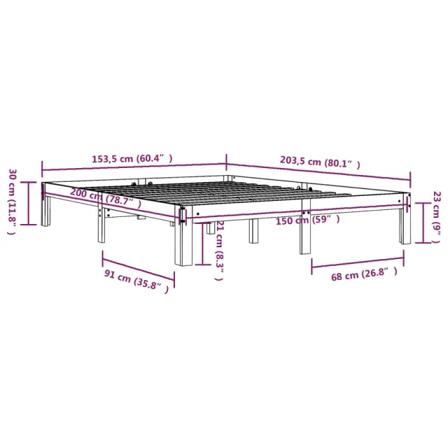 Ustvarite moderno spalnico s tem lesenim posteljnim okvirjem! To je praktičen in dekorativen dodatek za vaše notranje prostore. Vrhunska trdna borovina: Trdna borovina je čudovit naravni material. Borovina ima ravne vzorce, grče pa dajejo materialu njegov značilen, rustikalen videz.Stabilen posteljni okvir: Lesen okvir zagotavlja trdnost in stabilnost.Trdne letvice: Letvice iz vezanega lesa omogočajo dobro porazdelitev teže in zagotavljajo, da vzmetnica ostane na mestu ob vsakem zasuku in obračanju vašega telesa med spanjem. Opomba:Paket vsebuje samo posteljni okvir. Vzmetnica ni priložena. V naši trgovini si lahko ogledate ustrezne vzmetnice.Ta posteljni okvir je primeren za vzmetnico velikosti 150x200 cm (5FT King Size).Barva: BelaMaterial: Trdna borovinaMaterial letvic: Vezan lesCelotne dimenzije: 203,5 x 153,5 x 30 cm (D x Š x V)Spalna višina, merjena od tal: 23 cmVelikost primerne vzmetnice: 150 x 200 cm (Š x D) (vzmetnica ni priložena)Potrebno sestavljanje: Da