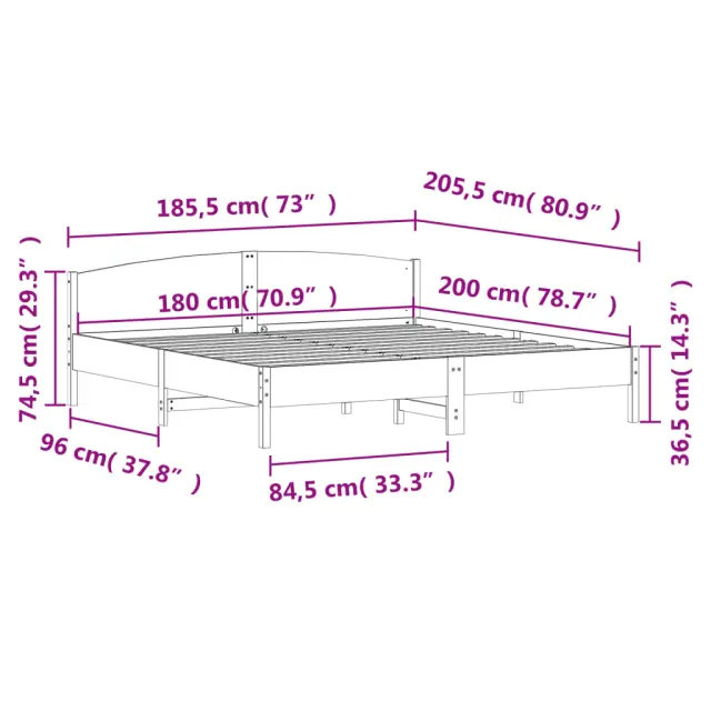 S tem lesenim posteljnim okvirjem lahko uživate v odličnem spancu! To je praktičen in dekorativen dodatek za vaše notranje prostore. Trdna borovina: Trdna borovina je čudovit naravni material. Borovina ima ravne vzorce, grče pa dajejo materialu njegov značilen, rustikalen videz.Letvice iz vezanega lesa: Letvice iz vezanega lesa omogočajo dobro porazdelitev teže in zagotavljajo, da vzmetnica ostane na mestu ob vsakem zasuku in obračanju med spanjem.Odlična opora: Vzglavje lesene postelje zagotavlja odlično oporo hrbtu, ko sedite v postelji in berete ali gledate televizijo. Dobro je vedeti:Vzmetnica ni priložena tej postelji. Ponujamo različno izbiro ležišč. V naši trgovini si lahko ogledate ustrezne vzmetnice.Barva: BelaMaterial: Trdna borovinaMaterial letvic: Vezan lesCelotne dimenzije: 205,5 x 185,5 x 74,5 cm (D x Š x V)Velikost primerne vzmetnice: 180 x 200 cm (Š x D) (vzmetnica ni priložena)Potrebno sestavljanje: Da