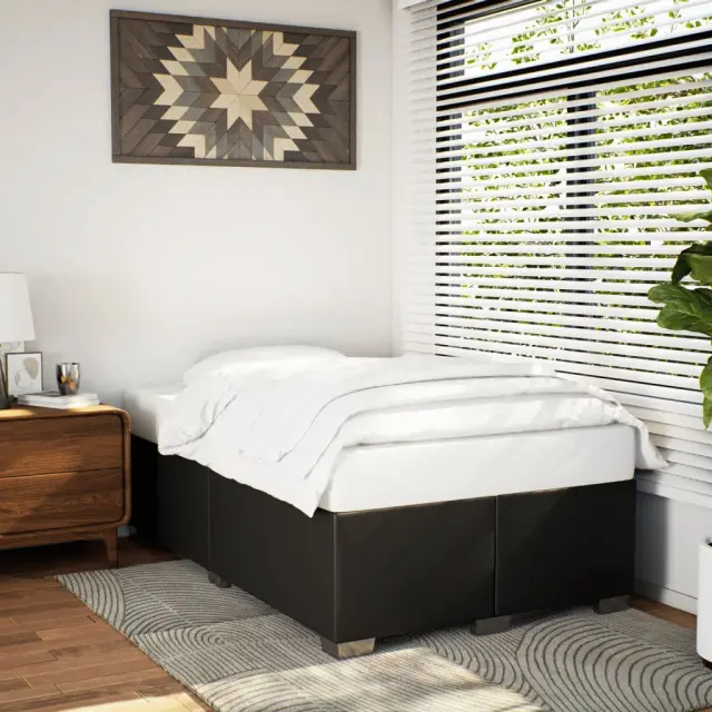 Zagotovite si boljši spanec s tem posteljnim okvirjem! Je prijeten dodatek za vsako spalnico. Dolgotrajno in enostavno vzdrževanje: Umetno usnje je zelo trpežen material, ki je odporen na madeže, zato ga zlahka očistite z vlažno krpo. Njegova gladka površina mu daje eleganten videz, ki spominja na pravo usnje.Letvice za optimalno podporo: Ta posteljni okvir je opremljen z letvicami, ki zagotavljajo osnovno podporo in zračnost vašega ležišča.Stabilne in vzdržljive noge: Ta postelja je podprta z robustnimi nogami, ki zagotavljajo stabilnost, varnost in trdnost. Dobro je vedeti:Vzmetnica ni priložena tej postelji. Ponujamo različno izbiro ležišč. V naši trgovini si lahko ogledate ustrezne vzmetnice.Barva: ČrnaMaterial: Umetno usnje (75 % polivinilklorid, 5 % bombaž, 20 % poliester), vezan les, inženirski les, trden borov lesDimenzije: 190 x 120 x 46 cm (D x Š x V)Primerno za velikost vzmetnice: 120 x 190 cm (Š x D) (vzmetnica ni priložena)Utrjene plastične nogicePodporne noge iz trdnega borovega lesaPotrebno sestavljanje: Da