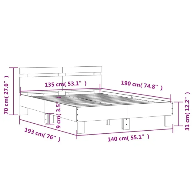 Zagotovite si boljši spanec s tem posteljnim okvirjem! Je prijeten dodatek za vsako spalnico. Vzdržljiv material: Inženirski les se ponaša z izjemno kakovostjo, gladko površino ter močjo, stabilnostjo in odpornostjo na vlago.Odlična opora: Posteljno vzglavje vam zagotavlja odlično oporo za hrbet, medtem ko sedite v postelji in berete ali gledate televizijo.Trdne letvice: Letvice iz vezanega lesa omogočajo dobro porazdelitev teže in zagotavljajo, da vzmetnica ostane na mestu ob vsakem zasuku in obračanju med spanjem. Dobro je vedeti:Vzmetnica ni priložena tej postelji. Ponujamo različno izbiro ležišč. V naši trgovini si lahko ogledate ustrezne vzmetnice.Barva: Rjav hrastMaterial posteljnega okvirja: Inženirski lesMaterial letvic: Vezan lesCelotne dimenzije: 193 x 140 x 70 cm (D x Š x V)Velikost primerne vzmetnice: 135 x 190 cm (Š x D) (vzmetnica ni priložena)Potrebno sestavljanje: Da