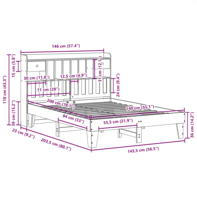 Zagotovite si boljši spanec s tem posteljnim okvirjem! Je prijeten dodatek za vsako spalnico. Stabilen in dolgotrajen okvir: Trdna borovina je znana po svoji trdnosti in trajnosti. Ravni vzorci in značilni vozli prispevajo k njenemu rustikalnemu čaru.Podnožje z letvami za optimalno podporo: Za podporo in zračnost ležišča je posteljni okvir opremljen z letvenim dnom.Dodaten prostor za shranjevanje: To elegantno vzglavje ima 6 priročnih predelkov in 2 predala, ki nudijo dovolj prostora za shranjevanje, da so vse vaše nočne potrebščine na dosegu roke. Za večje udobje je pod leseno posteljo dodaten prostor, v katerem lahko shranite škatle za shranjevanje, da bodo lepo skrite.Stabilne in vzdržljive noge: Ta postelja je podprta z robustnimi nogami, ki zagotavljajo stabilnost, varnost in trdnost.Samostoječe vzglavje: Samostoječe vzglavje ponuja brezskrbno rešitev za enostavno postavitev in premikanje brez potrebe po vgradnji na steno. Dobro je vedeti:Vzmetnica ni priložena tej postelji. Ponujamo različno izbiro ležišč. V naši trgovini si lahko ogledate ustrezne vzmetnice.Material: Trdna borovina (neobdelana)Material letvic: Vezan lesDimenzije: 226,5 x 146 x 110 cm (D x Š x V)Velikost primerne vzmetnice: 140 x 200 cm (Š x D) (vzmetnica ni priložena)S predelki za shranjevanjeZ 2 predalomaPotrebno sestavljanje: Da