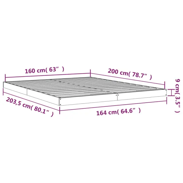 Ustvarite moderno spalnico s tem lesenim posteljnim okvirjem! To je praktičen in dekorativen dodatek za vaše notranje prostore. Trdna borovina: Trdna borovina je čudovit naravni material. Borovina ima ravne vzorce, grče pa dajejo materialu njegov značilen, rustikalen videz.Stabilen posteljni okvir: Lesen okvir zagotavlja trdnost in stabilnost.Trdne letvice: Letvice iz vezanega lesa omogočajo dobro porazdelitev teže in zagotavljajo, da vzmetnica ostane na mestu ob vsakem zasuku in obračanju med spanjem. Opomba:Paket vsebuje samo posteljni okvir. Vzmetnica ni priložena. V naši trgovini si lahko ogledate ustrezne vzmetnice.Ta posteljni okvir je primeren za vzmetnico velikosti 160 x 200 cm.Vsakemu izdelku je priložen priročnik za enostavno sestavljanje.Material posteljnega okvirja: Trdna borovina (neobdelana)Material letvic: Vezan lesCelotne dimenzije: 203,5 x 164 x 9 cm (D x Š x V)Velikost primerne vzmetnice: 160 x 200 cm (Š x D) (vzmetnica ni priložena)