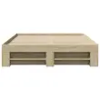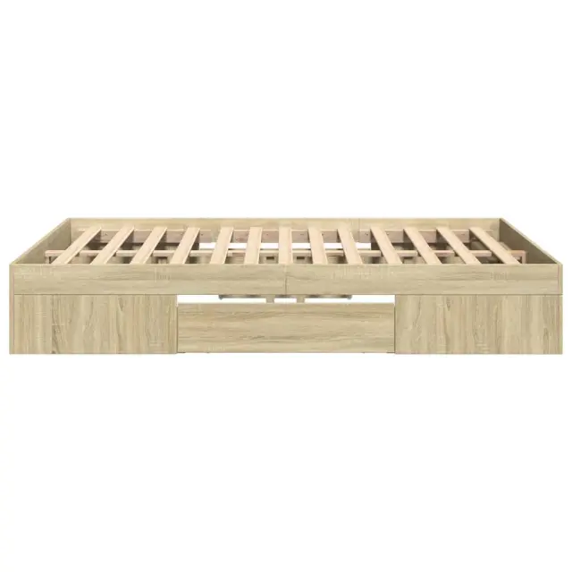 Zagotovite si boljši spanec s tem posteljnim okvirjem! Je prijeten dodatek za vsako spalnico. Vzdržljiv material: Posteljni okvir je izdelan iz inženirskega lesa. Inženirski les se ponaša z izjemno kakovostjo, gladko površino ter močjo, stabilnostjo in odpornostjo na vlago.Podnožje z letvami za optimalno podporo: Za podporo in zračnost ležišča je posteljni okvir opremljen z letvenim dnom.Funkcija shranjevanja: Ta posteljni okvir ima predale in odprte predelke za dobro organizacijo revij, knjig, igrač in drugih manjših predmetov. Dobro je vedeti:Vzmetnica ni priložena tej postelji. Ponujamo različno izbiro ležišč. V naši trgovini si lahko ogledate ustrezne vzmetnice.Barva: Sonoma hrastMaterial posteljnega okvirja: Inženirski lesMaterial letvic: Vezan lesCelotne dimenzije: 193 x 123 x 33 cm (D x Š x V)Dimenzije predelkov (vsak): 43,5 x 14,5 x 10 cm (D x Š x V)Dimenzije predalov (vsak): 79,5 x 28,5 x 18 cm (D x Š x V)Velikost primerne vzmetnice: 120 x 190 cm (Š x D) (vzmetnica ni priložena)Potrebno sestavljanje: Da
