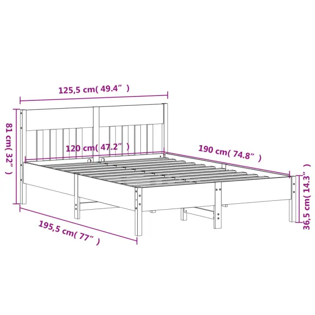 S tem lesenim posteljnim okvirjem lahko uživate v odličnem spancu! To je praktičen in dekorativen dodatek za vaše notranje prostore. Trdna borovina: Trdna borovina je čudovit naravni material. Borovina ima ravne vzorce, grče pa dajejo materialu njegov značilen, rustikalen videz.Letvice iz vezanega lesa: Letvice iz vezanega lesa omogočajo dobro porazdelitev teže in zagotavljajo, da vzmetnica ostane na mestu ob vsakem zasuku in obračanju med spanjem.Odlična opora: Vzglavje lesene postelje zagotavlja odlično oporo hrbtu, ko sedite v postelji in berete ali gledate televizijo. Dobro je vedeti:Vzmetnice niso priložene tej postelji. Ponujamo različno izbiro ležišč. V naši trgovini si lahko ogledate ustrezne vzmetnice.Barva: Voščeno rjavaMaterial: Trdna borovinaMaterial letvic: Vezan lesCelotne dimenzije: 195,5 x 125,5 x 81 cm (D x Š x V)Velikost primerne vzmetnice: 120 x 190 cm (Š x D) (vzmetnica ni priložena)Potrebno sestavljanje: Da