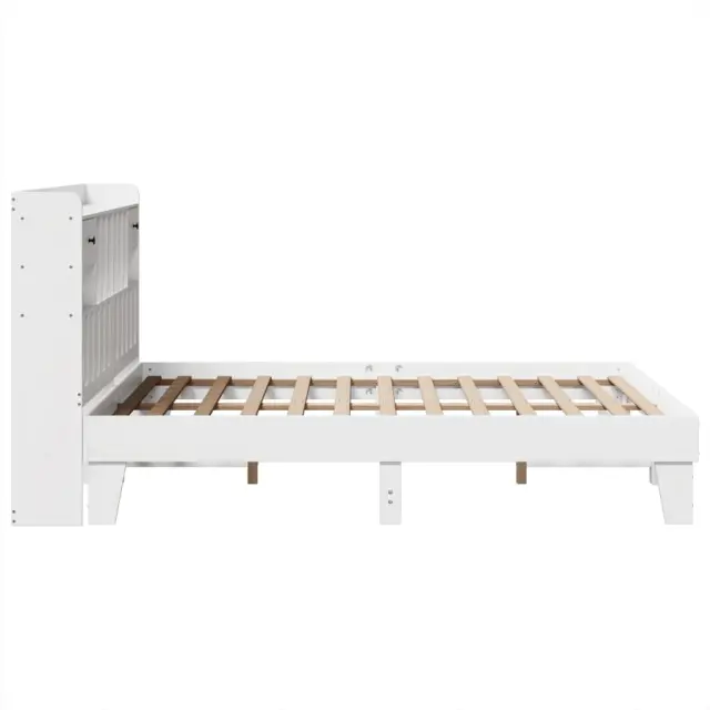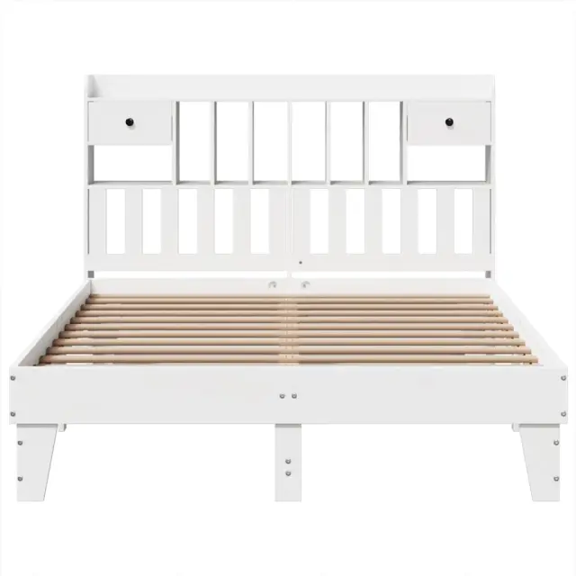 Zagotovite si boljši spanec s tem posteljnim okvirjem! Je prijeten dodatek za vsako spalnico. Stabilen in dolgotrajen okvir: Trdna borovina je znana po svoji trdnosti in trajnosti. Ravni vzorci in značilni vozli prispevajo k njenemu rustikalnemu čaru.Podnožje z letvami za optimalno podporo: Za podporo in zračnost ležišča je posteljni okvir opremljen z letvenim dnom.Dodaten prostor za shranjevanje: To elegantno vzglavje ima 6 priročnih predelkov in 2 predala, ki nudijo dovolj prostora za shranjevanje, da so vse vaše nočne potrebščine na dosegu roke. Za večje udobje je pod leseno posteljo dodaten prostor, v katerem lahko shranite škatle za shranjevanje, da bodo lepo skrite.Stabilne in vzdržljive noge: Ta postelja je podprta z robustnimi nogami, ki zagotavljajo stabilnost, varnost in trdnost.Samostoječe vzglavje: Samostoječe vzglavje ponuja brezskrbno rešitev za enostavno postavitev in premikanje brez potrebe po vgradnji na steno. Dobro je vedeti:Vzmetnica ni priložena tej postelji. Ponujamo različno izbiro ležišč. V naši trgovini si lahko ogledate ustrezne vzmetnice.Barva: BelaMaterial: Trdna borovinaMaterial letvic: Vezan lesDimenzije: 226,5 x 156 x 110 cm (D x Š x V)Velikost primerne vzmetnice: 150 x 200 cm (Š x D) (vzmetnica ni priložena)S predelki za shranjevanjeZ 2 predalomaPotrebno sestavljanje: Da
