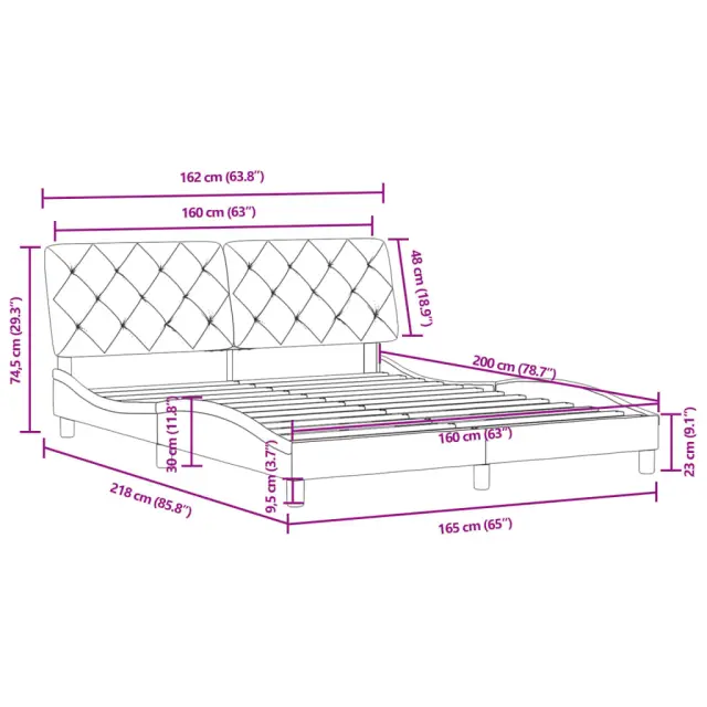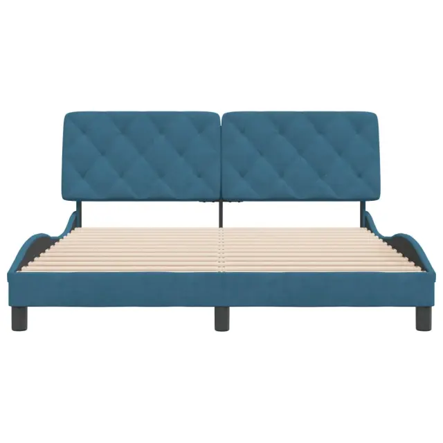 Zagotovite si boljši spanec s tem posteljnim okvirjem z vzglavjem! Je prijeten dodatek za vsako spalnico. Mehak žamet: Žamet je mehka in udobna tkanina, ki je prijetna do kože.Letvice iz vezanega lesa: Letvice iz vezanega lesa omogočajo dobro porazdelitev teže in zagotavljajo, da vzmetnica ostane na mestu ob vsakem zasuku in obračanju med spanjem.Odlična podpora: Vzglavna stranica je napolnjena s peno za izjemno mehkobo in optimalno udobje ter zagotavlja odlično podporo hrbtu, ko sedite v postelji in berete ali gledate televizijo.Priročna zasnova: Vzglavna stranica ima zadrgo za preprosto namestitev, pripenjala na zadnji strani pa se lahko uporabijo za pritrditev LED lučk.Valovita stranica: Valoviti videz posteljnega okvirja je eleganten in prefinjen. Dekorju v vašem domu dodaja sodoben in eleganten pridih ter tako postane osrednja točka spalnice. Dobro je vedeti:Vzmetnica ni priložena tej postelji. Ponujamo različno izbiro ležišč. V naši trgovini si lahko ogledate ustrezne vzmetnice.Posteljni okvir z vzglavjem:Barva: ModraMaterial: Žamet (100 % poliester), kovina, trdna borovina, vezan les, inženirski lesCelotne dimenzije: 218 x 165 x 74,5 cm (D x Š x V)Velikost primerne vzmetnice: 160 x 200 cm (Š x D) (vzmetnica ni priložena)Oblazinjeno vzglavje:Barva: ModraMaterial: Žamet (100 % poliester)Material polnila: PenaDimenzije: 162 x 6 x 48 cm (D x Š x V)Primerna širina vzmetnice: 160 cmPotrebno sestavljanje: DaPaket vsebuje:1 x Posteljni okvir z vzglavjem1 x Oblazinjeno vzglavje