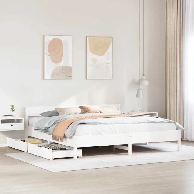 Posteljni Okvir - Dvoposteljna postelja brez vzmetnice bel 200x200 cm trdna borovina
