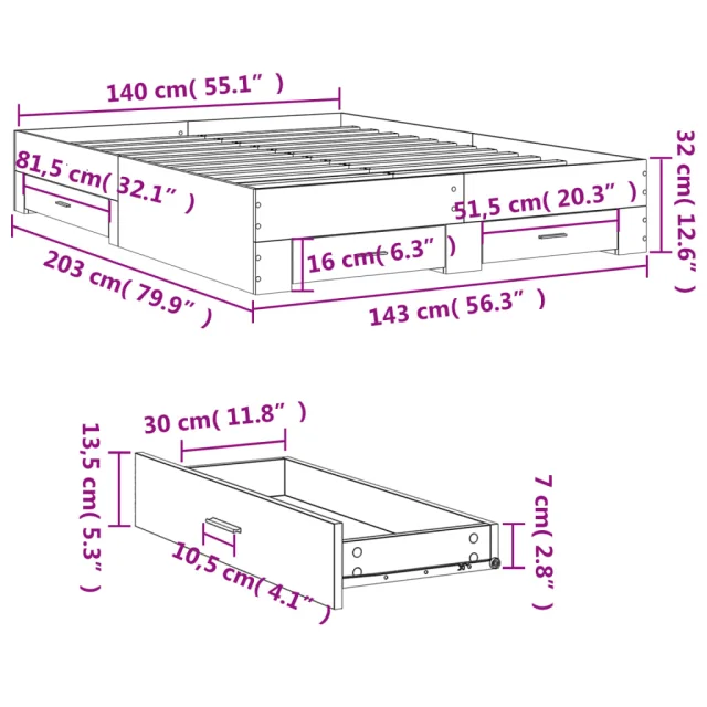 Posteljni okvir - Dvoposteljna postelja - Zakonska postelja s predali betonsko siv 140x200cm inženirski les