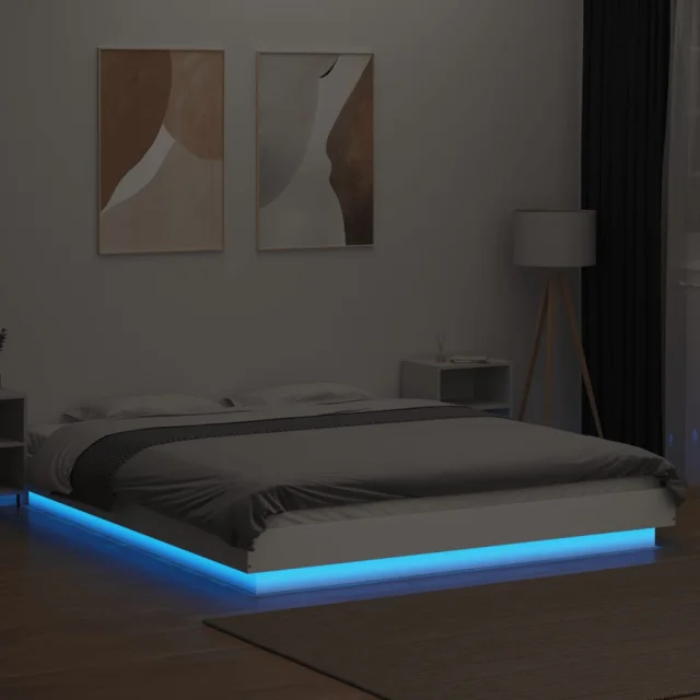 Posteljni okvir - Dvoposteljna postelja - Zakonska postelja z LED lučkami bel 160x200 cm inženirski les