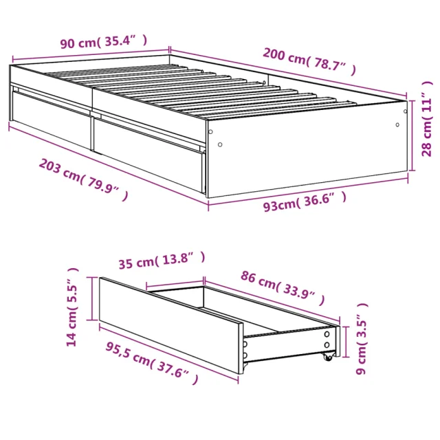 Posteljni okvir - Enojna postelja - Postelja za odrasle s predali dimljen hrast 90x200 cm inž. les