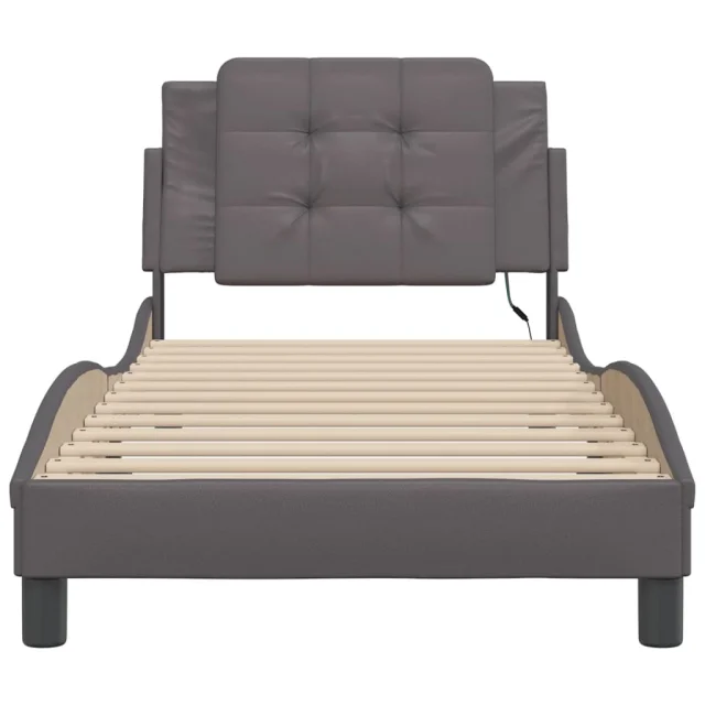 Posteljni okvir - Enojna postelja - Postelja za odrasle z LED lučkami siv 90x200 cm umetno usnje