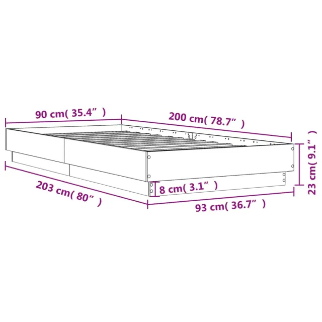 Zagotovite si boljši spanec s tem posteljnim okvirjem! Je prijeten dodatek za vsako spalnico. Vzdržljiv material: Inženirski les se ponaša z izjemno kakovostjo, gladko površino ter močjo, stabilnostjo in odpornostjo na vlago.Trdne letvice: Letvice iz vezanega lesa omogočajo dobro porazdelitev teže in zagotavljajo, da vzmetnica ostane na mestu ob vsakem zasuku in obračanju med spanjem.Močan in stabilen okvir: Lesen okvir omarice zagotavlja trdnost in stabilnost. Dobro je vedeti:Vzmetnica ni priložena tej postelji. Ponujamo različno izbiro ležišč. V naši trgovini si lahko ogledate ustrezne vzmetnice.Barva: Siva sonomaMaterial posteljnega okvirja: Inženirski lesMaterial letvic: Vezan lesCelotne dimenzije: 203 x 93 x 23 cm (D x Š x V)Velikost primerne vzmetnice: 90 x 200 cm (Š x D) (vzmetnica ni priložena)Potrebno sestavljanje: Da