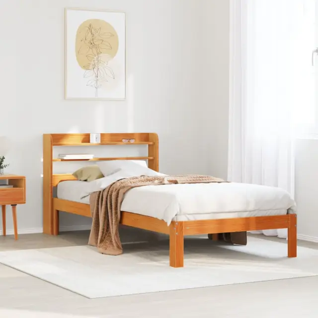 Zagotovite si boljši spanec s tem posteljnim okvirjem! Je prijeten dodatek za vsako spalnico. Stabilen in dolgotrajen okvir: Trdna borovina je znana po svoji trdnosti in trajnosti. Ravni vzorci in značilni vozli prispevajo k njenemu rustikalnemu čaru.Podnožje z letvami za optimalno podporo: Za podporo in zračnost ležišča je posteljni okvir opremljen z letvenim dnom.Veliko prostora za shranjevanje: To elegantno vzglavje ima tri priročne police, ki ponujajo veliko prostora za shranjevanje, da bodo vaše večerne potrebščine na dosegu roke.Samostoječe vzglavje: Samostoječe vzglavje ponuja brezskrbno rešitev za enostavno postavitev in premikanje brez potrebe po vgradnji na steno. Dobro je vedeti:Vzmetnica ni priložena tej postelji. Ponujamo različno izbiro ležišč. V naši trgovini si lahko ogledate ustrezne vzmetnice.Barva: Voščeno rjavaMaterial: Trdna borovinaMaterial letvic: Vezan lesCelotne dimenzije: 206 x 85 x 82 cm (D x Š x V)Velikost primerne vzmetnice: 75 x 190 cm (Š x D) (vzmetnica ni priložena)S policami za shranjevanjePotrebno sestavljanje: Da Paket vsebuje:1 x Posteljni okvir1 x Vzglavje