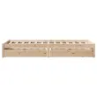 Zagotovite si boljši spanec s tem posteljnim okvirjem! Je prijeten dodatek za vsako spalnico. Stabilen in dolgotrajen okvir: Trdna borovina je znana po svoji trdnosti in trajnosti. Ravni vzorci in značilni vozli prispevajo k njenemu rustikalnemu čaru.Podnožje z letvami za optimalno podporo: Za podporo in zračnost ležišča je posteljni okvir opremljen z letvenim dnom.Popolnoma izkoriščen prostor: Ta posteljni okvir ima spodaj dva predala, ki omogočata shranjevanje predmetov, kot so dodatna posteljnina, sezonska oblačila in igrače.Preprosto manevriranje: Ta predal za shranjevanje pod posteljo ima štiri kolesa, ki zagotavljajo gladko in lahkotno manevriranje pri drsenju pod posteljo in izpod nje. Dobro je vedeti:Vzmetnica ni priložena tej postelji. Ponujamo različno izbiro ležišč. V naši trgovini si lahko ogledate ustrezne vzmetnice.Material: Trdna borovina (neobdelana)Potrebno sestavljanje: DaPostelja:Dimenzije: 195,5 x 80,5 x 31 cm (D x Š x V)Višina spalnega prostora, merjena od tal: 31 cmVišina prostora pod posteljo: 21 cmVelikost primerne vzmetnice: 75 x 190 cm (Š x D) (vzmetnica ni priložena)Največja nosilnost (z ležiščem): 100 kgZ letvenim podomPredal:Zunanje dimenzije: 90 x 55 x 16 cm (Š x G x V)Notranje dimenzije: 81,5 x 52,5 x 10 cm (Š x G x V)Maks. nosilnost (vsaka): 20 kgS štirimi kolesiPaket vsebuje:1 x Posteljni okvir z letvenim podnožjem2 x Predal