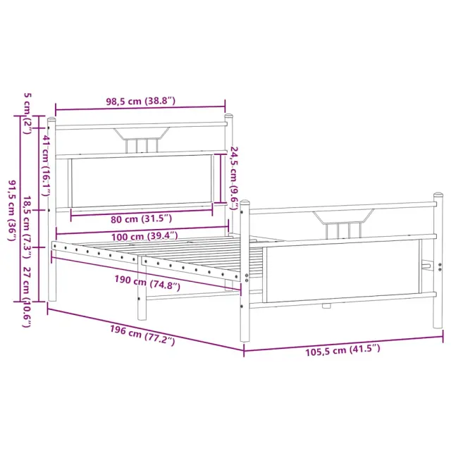 Zagotovite si boljši spanec s tem posteljnim okvirjem! Je prijeten dodatek za vsako spalnico. Stabilen in dolgotrajen okvir: Jeklo je močno, stabilno in trpežno, zato je idealna izbira za številne aplikacije, od proizvodnje pohištva do gradbeništva.Funkcionalno vzglavje in podnožje: Vzglavje in podnožje posteljnega dna ohranjata ležišče na mestu. Poleg tega vzglavje zagotavlja odlično oporo hrbtu, ko sedite v postelji in berete ali gledate televizijo.Dodaten prostor za shranjevanje: Za udobje ima posteljni podstavek pod seboj dodaten prostor, v katerem lahko shranite škatle za shranjevanje, ki niso vidne.Podnožje z letvami za optimalno podporo: Kovinski posteljni okvir je opremljen z letvenim dnom, ki zagotavlja oporo in zračnost ležišča. Dobro je vedeti:Vzmetnica ni priložena tej postelji. Ponujamo različno izbiro ležišč. V naši trgovini si lahko ogledate ustrezne vzmetnice.Barva: Dimljeni hrastMaterial: Inženirski les in jekloCelotne dimenzije: 196 x 105,5 x 91,5 cm (D x Š x V)Višina prostora pod posteljo: 27 cmVelikost primerne vzmetnice: 100 x 190 cm (Š x D) (vzmetnica ni priložena)Z vzglavjem in podnožjemPotrebno sestavljanje: Da