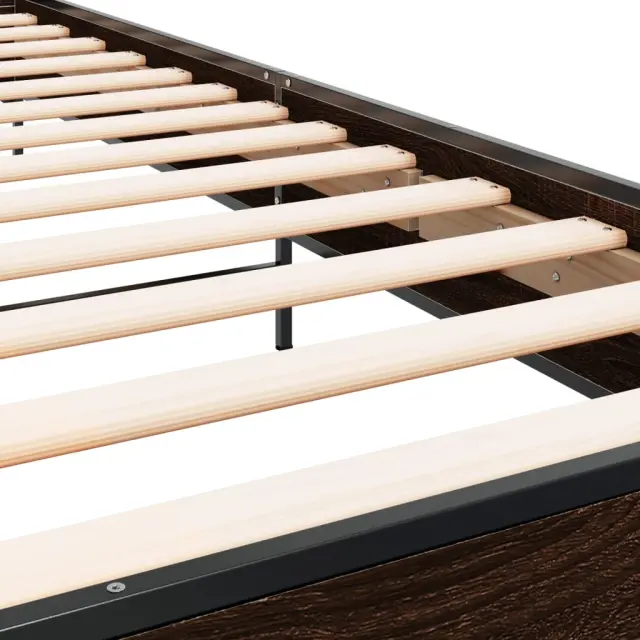 Zagotovite si boljši spanec s tem posteljnim okvirjem! Je prijeten dodatek za vsako spalnico. Vzdržljiv material: Inženirski les se ponaša z izjemno kakovostjo, gladko površino ter močjo, stabilnostjo in odpornostjo na vlago.Kovinske noge: Postelja je podprta s čvrstimi kovinskimi nogami, ki zagotavljajo njeno stabilnost, varnost in trdnost.Letvice iz vezanega lesa: Letvice iz vezanega lesa omogočajo dobro porazdelitev teže in zagotavljajo, da vzmetnica ostane na mestu ob vsakem zasuku in obračanju med spanjem.Odlična podpora: Vzglavje zagotavlja odlično oporo hrbtu, ko sedite v postelji in berete ali gledate televizijo. Dobro je vedeti:Vzmetnica ni priložena tej postelji. Ponujamo različno izbiro ležišč. V naši trgovini si lahko ogledate ustrezne vzmetnice.Barva: Rjav hrastMaterial posteljnega okvirja: Inženirski les, kovinaMaterial letvic: Vezan lesCelotne dimenzije: 193 x 93 x 80 cm (D x Š x V)Velikost primerne vzmetnice: 90 x 190 cm (Š x D) (vzmetnica ni priložena)Maksimalna nosilnost: 100 kgPotrebno sestavljanje: Da