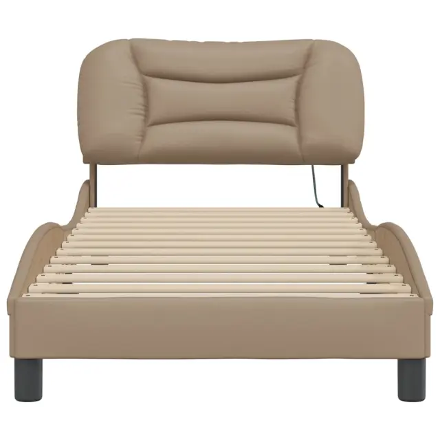 Zagotovite si boljši spanec s tem posteljnim okvirjem z LED lučkami! Je prijeten dodatek za vsako spalnico. Trpežno umetno usnje: Vrhunsko umetno usnje je zelo vzdržljiv material. Je odporno na madeže, zato ga lahko preprosto čistite z vlažno krpo. Gladka površina mu prav tako daje razkošen videz in lepoto pravega usnja.Letvice iz vezanega lesa: Letvice iz vezanega lesa omogočajo dobro porazdelitev teže in zagotavljajo, da vzmetnica ostane na mestu ob vsakem zasuku in obračanju med spanjem.Udobna opora: To vzglavje za posteljo vam zagotavlja odlično oporo za hrbet, ko sedite na postelji in berete ali gledate filme.Barvit LED trak: Vnesite igrivost v temo z barvitimi LED lučkami! Kljuke in zanke na hrbtni strani vzglavja lahko uporabite za pritrditev LED lučk.Valovita stranica: Valoviti videz posteljnega okvirja je eleganten in prefinjen. Dekorju v vašem domu dodaja sodoben in eleganten pridih ter tako postane osrednja točka spalnice. Dobro je vedeti:Vzmetnica ni priložena tej postelji. Ponujamo različno izbiro ležišč. V naši trgovini si lahko ogledate ustrezne vzmetnice.Izdelek ima priključek USB, ki zahteva certificiran vir napajanja 5 V USB (ni priložen).Posteljni okvir:Barva: KapučinoMaterial: Umetno usnje (75 % polivinilklorid, 5 % bombaž, 20 % poliester), kovina, trdna borovina, vezan les, inženirski lesCelotne dimenzije: 218 x 85 x 74,5 cm (D x Š x V)Velikost primerne vzmetnice: 80 x 200 cm (Š x D) (vzmetnica ni priložena)Potrebno sestavljanje: DaOblazinjeno vzglavje:Barva: KapučinoMaterial: Umetno usnje (75 % polivinilklorid, 5 % bombaž, 20 % poliester)Material polnila: PP vlaknaDimenzije: 90 x 15 x 48 cm (D x Š x V)Širina primerne vzmetnice: 80 cmLED trak:Dolžina: 55 cmNapetost: DC 5 VDolžina kabla USB: 140 cmDolžina električnega kabla: 30 cmIP ocena: IP65Paket vsebuje:1 x Posteljni okvir1 x Oblazinjeno vzglavje1 x LED trak Ta izdelek se napaja z DC 5 V, vendar certificirani 5 V vir napajanja USB ni priložen. Višja napetost lahko povzroči pregrevanje in poškoduje napravo ter povzroči potencialno nevarnost pregrevanja in požara.