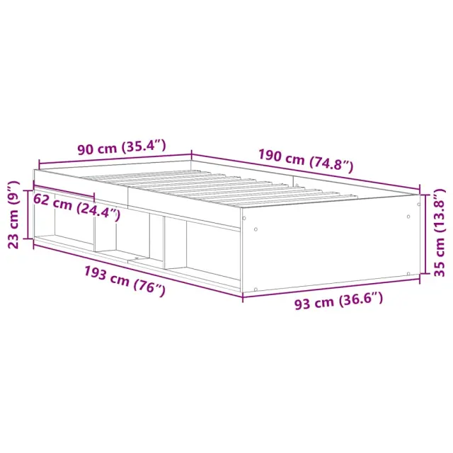 Zagotovite si boljši spanec s tem posteljnim okvirjem! Je prijeten dodatek za vsako spalnico. Vzdržljiv material: Inženirski les se ponaša z izjemno kakovostjo, gladko površino ter močjo, stabilnostjo in odpornostjo na vlago. Dodaten prostor za shranjevanje: Za večje udobje je pod posteljo dodaten prostor, v katerem lahko shranite škatle za shranjevanje, da bodo lepo skrite.Letvice iz vezanega lesa: Letvice iz vezanega lesa omogočajo dobro porazdelitev teže in zagotavljajo, da vzmetnica ostane na mestu ob vsakem zasuku in obračanju med spanjem. Dobro je vedeti:Vzmetnica ni priložena tej postelji. Ponujamo različno izbiro ležišč. V naši trgovini si lahko ogledate ustrezne vzmetnice.Barva: Starinski lesMaterial posteljnega okvirja: Inženirski les, trdna borovinaMaterial letvic: Vezan lesCelotne dimenzije: 193 x 93 x 35 cm (D x Š x V)Velikost primerne vzmetnice: 90 x 190 cm (Š x D) (vzmetnica ni priložena)Potrebno sestavljanje: Da