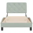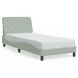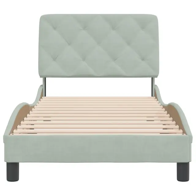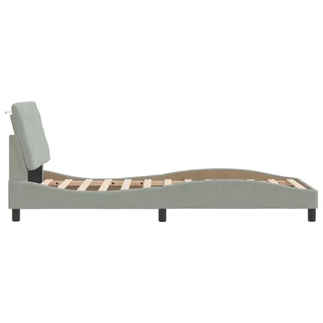 Zagotovite si boljši spanec s tem posteljnim okvirjem z vzglavjem! Je prijeten dodatek za vsako spalnico. Mehak žamet: Žamet je mehka in udobna tkanina, ki je prijetna do kože.Letvice iz vezanega lesa: Letvice iz vezanega lesa omogočajo dobro porazdelitev teže in zagotavljajo, da vzmetnica ostane na mestu ob vsakem zasuku in obračanju med spanjem.Odlična podpora: Vzglavna stranica je napolnjena s peno za izjemno mehkobo in optimalno udobje ter zagotavlja odlično podporo hrbtu, ko sedite v postelji in berete ali gledate televizijo.Priročna zasnova: Vzglavna stranica ima zadrgo za preprosto namestitev, pripenjala na zadnji strani pa se lahko uporabijo za pritrditev LED lučk.Valovita stranica: Valoviti videz posteljnega okvirja je eleganten in prefinjen. Dekorju v vašem domu dodaja sodoben in eleganten pridih ter tako postane osrednja točka spalnice. Dobro je vedeti:Vzmetnica ni priložena tej postelji. Ponujamo različno izbiro ležišč. V naši trgovini si lahko ogledate ustrezne vzmetnice.Posteljni okvir z vzglavjem:Barva: Svetlo sivaMaterial: Žamet (100 % poliester), kovina, trdna borovina, vezan les, inženirski lesCelotne dimenzije: 218 x 95 x 74,5 cm (D x Š x V)Velikost primerne vzmetnice: 90 x 200 cm (Š x D) (vzmetnica ni priložena)Oblazinjeno vzglavje:Barva: Svetlo sivaMaterial: Žamet (100 % poliester)Material polnila: PenaDimenzije: 92 x 6 x 48 cm (D x Š x V)Primerna širina vzmetnice: 90 cmPotrebno sestavljanje: DaPaket vsebuje:1 x Posteljni okvir z vzglavjem1 x Oblazinjeno vzglavje