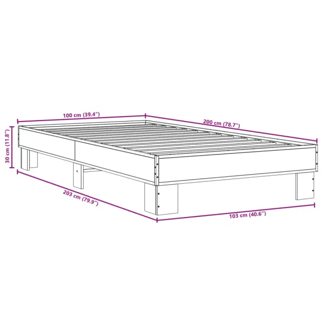 Zagotovite si boljši spanec s tem posteljnim okvirjem! Je prijeten dodatek za vsako spalnico. Vzdržljiv material: Inženirski les se ponaša z izjemno kakovostjo, gladko površino ter močjo, stabilnostjo in odpornostjo na vlago.Kovinske noge: Postelja je podprta s čvrstimi kovinskimi nogami, ki zagotavljajo njeno stabilnost, varnost in trdnost.Letvice iz vezanega lesa: Letvice iz vezanega lesa omogočajo dobro porazdelitev teže in zagotavljajo, da vzmetnica ostane na mestu ob vsakem zasuku in obračanju med spanjem. Dobro je vedeti:Vzmetnica ni priložena tej postelji. Ponujamo različno izbiro ležišč. V naši trgovini si lahko ogledate ustrezne vzmetnice.Barva: Dimljeni hrastMaterial posteljnega okvirja: Inženirski les, kovinaMaterial letvic: Vezan lesCelotne dimenzije: 203 x 103 x 30 cm (D x Š x V)Velikost primerne vzmetnice: 100 x 200 cm (Š x D) (vzmetnica ni priložena)Maksimalna nosilnost: 100 kgPotrebno sestavljanje: Da