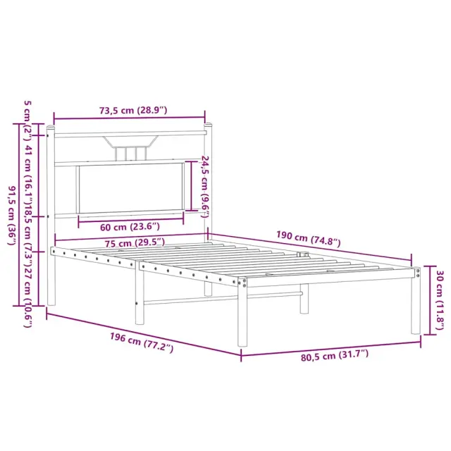 Zagotovite si boljši spanec s tem posteljnim okvirjem! Je prijeten dodatek za vsako spalnico. Stabilen in dolgotrajen okvir: Jeklo je močno, stabilno in trpežno, zato je idealna izbira za številne aplikacije, od proizvodnje pohištva do gradbeništva.Vsestransko vzglavje: Ta postelja je opremljena z vzglavjem, ki zagotavlja odlično oporo hrbtu, ko sedite v postelji in berete ali gledate televizijo, hkrati pa služi tudi kot dekorativni element.Dodaten prostor za shranjevanje: Za udobje ima posteljni podstavek pod seboj dodaten prostor, v katerem lahko shranite škatle za shranjevanje, ki niso vidne.Podnožje z letvami za optimalno podporo: Kovinski posteljni okvir je opremljen z letvenim dnom, ki zagotavlja oporo in zračnost ležišča. Dobro je vedeti:Vzmetnica ni priložena tej postelji. Ponujamo različno izbiro ležišč. V naši trgovini si lahko ogledate ustrezne vzmetnice.Barva: Sonoma hrastMaterial: Inženirski les in jekloCelotne dimenzije: 196 x 80,5 x 91,5 cm (D x Š x V)Višina prostora pod posteljo: 27 cmVelikost primerne vzmetnice: 75 x 190 cm (Š x D) (vzmetnica ni priložena)Z vzglavjemPotrebno sestavljanje: Da