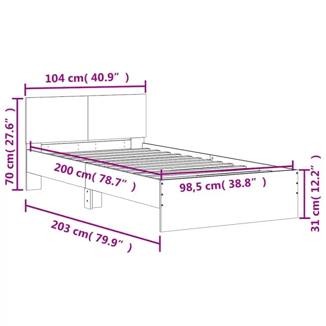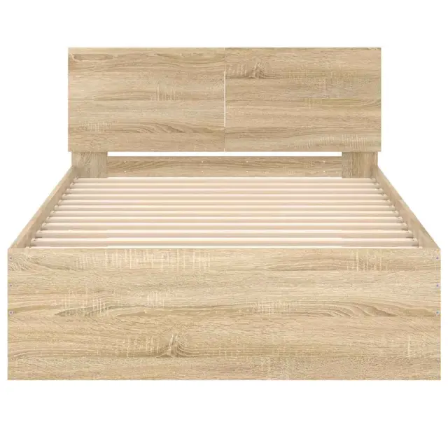 Zagotovite si boljši spanec s tem posteljnim okvirjem z vzglavjem! Je prijeten dodatek za vsako spalnico. Vzdržljiv material: Inženirski les se ponaša z izjemno kakovostjo, gladko površino ter močjo, stabilnostjo in odpornostjo na vlago.Odlična opora: Posteljno vzglavje vam zagotavlja odlično oporo za hrbet, medtem ko sedite v postelji in berete ali gledate televizijo.Trdne letvice: Letvice iz vezanega lesa omogočajo dobro porazdelitev teže in zagotavljajo, da vzmetnica ostane na mestu ob vsakem zasuku in obračanju med spanjem. Dobro je vedeti:Vzmetnica ni priložena tej postelji. Ponujamo različno izbiro ležišč. V naši trgovini si lahko ogledate ustrezne vzmetnice.Barva: Sonoma hrastMaterial posteljnega okvirja: Inženirski lesMaterial letvic: Vezan lesSkupne mere: 203 x 104 x 70 cm (D x Š x V)Velikost primerne vzmetnice: 100 x 200 cm (Š x D) (vzmetnica ni priložena)Potrebno sestavljanje: Da