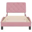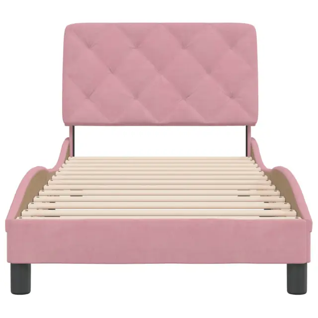 Zagotovite si boljši spanec s tem posteljnim okvirjem z vzglavjem! Je prijeten dodatek za vsako spalnico. Mehak žamet: Žamet je mehka in udobna tkanina, ki je prijetna do kože.Letvice iz vezanega lesa: Letvice iz vezanega lesa omogočajo dobro porazdelitev teže in zagotavljajo, da vzmetnica ostane na mestu ob vsakem zasuku in obračanju med spanjem.Odlična podpora: Vzglavna stranica je napolnjena s peno za izjemno mehkobo in optimalno udobje ter zagotavlja odlično podporo hrbtu, ko sedite v postelji in berete ali gledate televizijo.Priročna zasnova: Vzglavna stranica ima zadrgo za preprosto namestitev, pripenjala na zadnji strani pa se lahko uporabijo za pritrditev LED lučk.Valovita stranica: Valoviti videz posteljnega okvirja je eleganten in prefinjen. Dekorju v vašem domu dodaja sodoben in eleganten pridih ter tako postane osrednja točka spalnice. Dobro je vedeti:Vzmetnica ni priložena tej postelji. Ponujamo različno izbiro ležišč. V naši trgovini si lahko ogledate ustrezne vzmetnice.Posteljni okvir z vzglavjem:Barva: RozaMaterial: Žamet (100 % poliester), kovina, trdna borovina, vezan les, inženirski lesCelotne dimenzije: 218 x 95 x 74,5 cm (D x Š x V)Velikost primerne vzmetnice: 90 x 200 cm (Š x D) (vzmetnica ni priložena)Oblazinjeno vzglavje:Barva: RozaMaterial: Žamet (100 % poliester)Material polnila: PenaDimenzije: 92 x 6 x 48 cm (D x Š x V)Primerna širina vzmetnice: 90 cmPotrebno sestavljanje: DaPaket vsebuje:1 x Posteljni okvir z vzglavjem1 x Oblazinjeno vzglavje