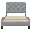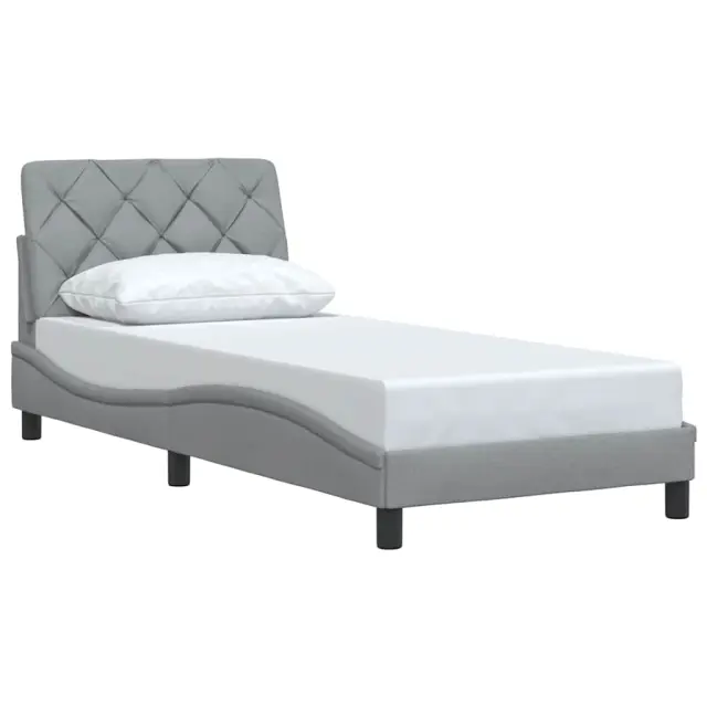 Zagotovite si boljši spanec s tem posteljnim okvirjem! Je prijeten dodatek za vsako spalnico. Mehak in trpežen material: Tkanina iz poliestra ponuja kombinacijo mehkobe, zračnosti in trpežnosti ter vam zagotavlja popolno udobje in prijetnost.Letvice za optimalno podporo: Ta posteljni okvir je opremljen z letvicami, ki zagotavljajo osnovno podporo in zračnost vašega ležišča.Vsestransko vzglavje: Ta posteljni okvir je opremljen z vzglavjem, ki zagotavlja odlično oporo hrbtu, ko sedite v postelji in berete ali gledate televizijo, hkrati pa služi tudi kot dekorativni element.Priročna zasnova: Vzglavna stranica ima zadrgo za preprosto namestitev, pripenjala na zadnji strani pa se lahko uporabijo za pritrditev LED lučk.Valovita stranica: Valoviti videz posteljnega okvirja je eleganten in prefinjen. Dekorju v vašem domu dodaja sodoben in eleganten pridih ter tako postane osrednja točka spalnice. Dobro je vedeti:Vzmetnica ni priložena tej postelji. Ponujamo različno izbiro ležišč. V naši trgovini si lahko ogledate ustrezne vzmetnice.Posteljni okvir:Barva: Svetlo sivaMaterial: Tkanina (100 % poliester), kovina, vezan les, inženirski lesCelotne dimenzije: 218 x 95 x 74,5 cm (D x Š x V)Velikost primerne vzmetnice: 90 x 200 cm (Š x D) (vzmetnica ni priložena)Oblazinjeno vzglavje:Barva: Svetlo sivaMaterial: Blago (100 % poliester)Material polnila: PP vlaknaDimenzije: 92 x 6 x 48 cm (D x Š x V)Paket vsebuje:1 x Posteljni okvir1 x Oblazinjeno vzglavje