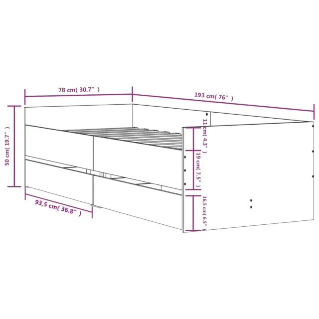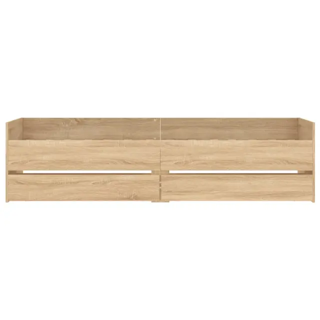 Dodajte svoji spalnici moderen pridih s tem posteljnim okvirjem s predali! Predstavlja praktičen in dekorativen dodatek za vaš bivalni prostor. Vzdržljiv material: Posteljni okvir je izdelan iz inženirskega lesa. Inženirski les se ponaša z izjemno kakovostjo, gladko površino ter močjo, stabilnostjo in odpornostjo na vlago.Trdne letvice: Letvice iz vezanega lesa omogočajo dobro porazdelitev teže in zagotavljajo, da vzmetnica ostane na mestu ob vsakem zasuku in obračanju med spanjem.Funkcija shranjevanja: Priloženi posteljni predali nudijo dovolj prostora za shranjevanje potrebščin, da bo soba čista in urejena. Dobro je vedeti:Vzmetnica ni priložena tej postelji. Ponujamo različno izbiro ležišč. V naši trgovini si lahko ogledate ustrezne vzmetnice.Barva: Sonoma hrastMaterial posteljnega okvirja: Inženirski lesMaterial letvic: Vezan lesCelotne dimenzije: 193 x 78 x 50 cm (D x Š x V)Dimenzije predala (vsak): 93,5 x 35 x 16,5 cm (D x Š x V)Velikost primerne vzmetnice: 75 x 190 cm (Š x D) (2FT6 Small Single) (vzmetnica ni priložena)Potrebno sestavljanje: DaPaket vsebuje:1 x Posteljni okvir2 x Predal
