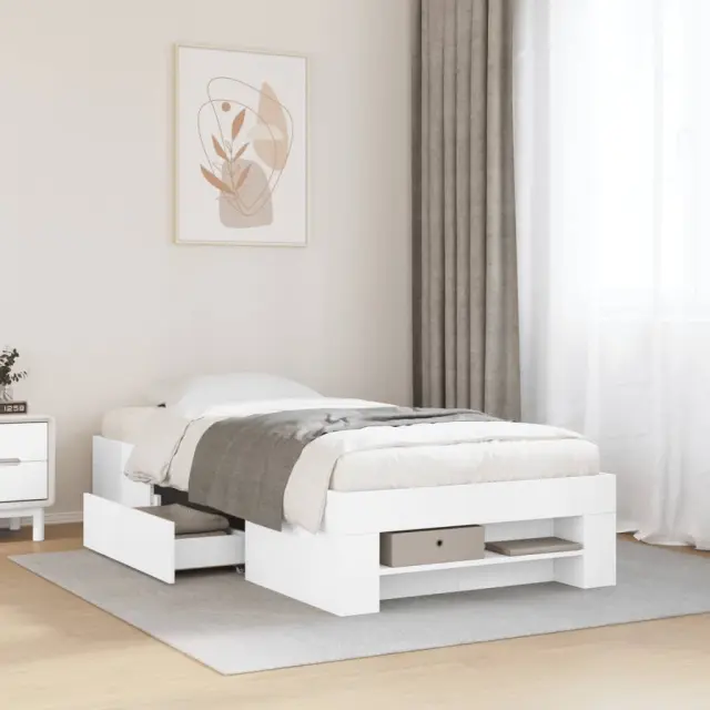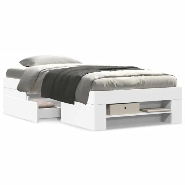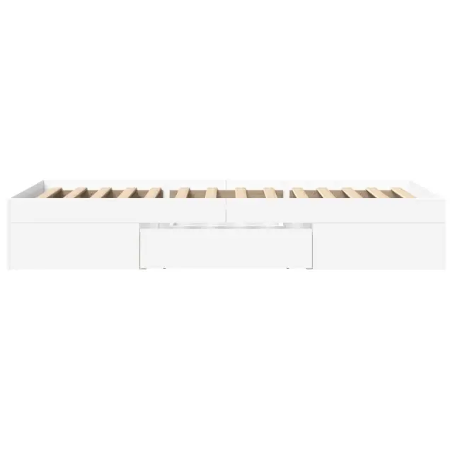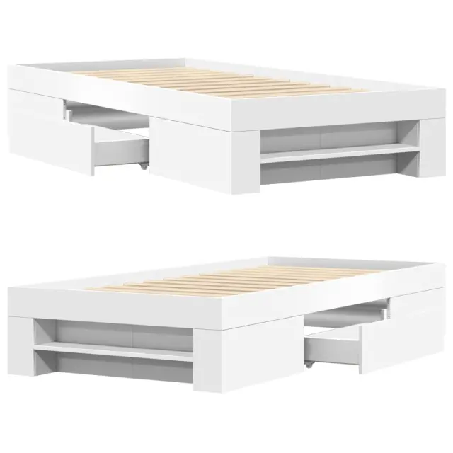 Zagotovite si boljši spanec s tem posteljnim okvirjem! Je prijeten dodatek za vsako spalnico. Vzdržljiv material: Posteljni okvir je izdelan iz inženirskega lesa. Inženirski les se ponaša z izjemno kakovostjo, gladko površino ter močjo, stabilnostjo in odpornostjo na vlago.Podnožje z letvami za optimalno podporo: Za podporo in zračnost ležišča je posteljni okvir opremljen z letvenim dnom.Funkcija shranjevanja: Ta posteljni okvir ima predale in odprte predelke za dobro organizacijo revij, knjig, igrač in drugih manjših predmetov. Dobro je vedeti:Vzmetnica ni priložena tej postelji. Ponujamo različno izbiro ležišč. V naši trgovini si lahko ogledate ustrezne vzmetnice.Barva: BelaMaterial posteljnega okvirja: Inženirski lesMaterial letvic: Vezan lesCelotne dimenzije: 203 x 93 x 33 cm (D x Š x V)Dimenzije predelkov (vsak): 69 x 14,5 x 10 cm (D x Š x V)Dimenzije predalov (vsak): 79,5 x 28,5 x 18 cm (D x Š x V)Velikost primerne vzmetnice: 90 x 200 cm (Š x D) (vzmetnica ni priložena)Potrebno sestavljanje: Da