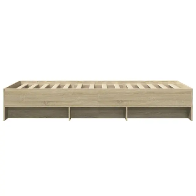 Zagotovite si boljši spanec s tem posteljnim okvirjem! Je prijeten dodatek za vsako spalnico. Vzdržljiv material: Posteljni okvir je izdelan iz inženirskega lesa. Inženirski les se ponaša z izjemno kakovostjo, gladko površino ter močjo, stabilnostjo in odpornostjo na vlago.Podnožje z letvami za optimalno podporo: Za podporo in zračnost ležišča je posteljni okvir opremljen z letvenim dnom.Funkcija shranjevanja: Ta posteljni okvir ima odprte predelke za dobro organizacijo revij, knjig, igrač in drugih manjših predmetov. Dobro je vedeti:Vzmetnica ni priložena tej postelji. Ponujamo različno izbiro ležišč. V naši trgovini si lahko ogledate ustrezne vzmetnice.Barva: Sonoma hrastMaterial posteljnega okvirja: Inženirski lesMaterial letvic: Vezan lesCelotne dimenzije: 203 x 93 x 35 cm (D x Š x V)Dimenzije predelka (vsak): 68,5/60 x 18,5 x 15 cm (D x Š x V)Velikost primerne vzmetnice: 90 x 200 cm (Š x D) (vzmetnica ni priložena)Potrebno sestavljanje: Da