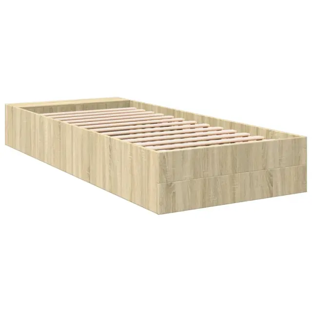 Dodajte svoji spalnici moderen pridih s tem posteljnim okvirjem! Je praktičen in dekorativen dodatek vašemu bivalnemu prostoru. Vzdržljiv material: Posteljni okvir je izdelan iz inženirskega lesa. Inženirski les se ponaša z izjemno kakovostjo, gladko površino ter močjo, stabilnostjo in odpornostjo na vlago.Trdne letvice: Letvice iz vezanega lesa omogočajo dobro porazdelitev teže in zagotavljajo, da vzmetnica ostane na mestu ob vsakem zasuku in obračanju med spanjem.Funkcija shranjevanja: Vključeni posteljni predelki nudijo dovolj prostora za shranjevanje potrebščin, da bo soba čista in urejena. Dobro je vedeti:Vzmetnica ni priložena tej postelji. Ponujamo različno izbiro ležišč. V naši trgovini si lahko ogledate ustrezne vzmetnice.Barva: Sonoma hrastMaterial posteljnega okvirja: Inženirski lesMaterial letvic: Vezan lesCelotne dimenzije: 225,5 x 93 x 30 cm (D x Š x V)Velikost primerne vzmetnice: 90 x 200 cm (Š x D) (vzmetnica ni priložena)Dimenzije predelka (vsak): 17 x 22,5 x 27 cm (D x Š x V)Potrebno sestavljanje: Da