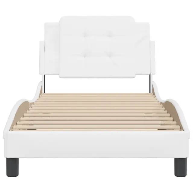 Zagotovite si boljši spanec s tem posteljnim okvirjem z vzglavjem! Je prijeten dodatek za vsako spalnico. Trpežno umetno usnje: Vrhunsko umetno usnje je zelo vzdržljiv material. Je odporno na madeže, zato ga lahko preprosto čistite z vlažno krpo. Gladka površina mu prav tako daje razkošen videz in lepoto pravega usnja.Letvice iz vezanega lesa: Letvice iz vezanega lesa omogočajo dobro porazdelitev teže in zagotavljajo, da vzmetnica ostane na mestu ob vsakem zasuku in obračanju med spanjem.Odlična podpora: Vzglavna stranica je napolnjena s peno za izjemno mehkobo in optimalno udobje ter zagotavlja odlično podporo hrbtu, ko sedite v postelji in berete ali gledate televizijo.Priročna zasnova: Oblazinjeno vzglavje ima zadrgo za enostavno namestitev.Valovita stranica: Valoviti videz posteljnega okvirja je eleganten in prefinjen. Dekorju v vašem domu dodaja sodoben in eleganten pridih ter tako postane osrednja točka spalnice. Dobro je vedeti:Vzmetnica ni priložena tej postelji. Ponujamo različno izbiro ležišč. V naši trgovini si lahko ogledate ustrezne vzmetnice.Posteljni okvir z vzglavjem:Barva: BelaMaterial: Umetno usnje (75 % polivinilklorid, 5 % bombaž, 20 % poliester), kovina, trdna borovina, vezan les, inženirski lesCelotne dimenzije: 218 x 95 x 74,5 cm (D x Š x V)Velikost primerne vzmetnice: 90 x 200 cm (Š x D) (vzmetnica ni priložena)Oblazinjeno vzglavje:Barva: BelaMaterial: Umetno usnje (75 % polivinilklorid, 5 % bombaž, 20 % poliester)Material polnila: PenaDimenzije: 90 x 3 x 48 cm (D x Š x V)Primerna širina vzmetnice: 90 cmPotrebno sestavljanje: DaPaket vsebuje:1 x Posteljni okvir z vzglavjem1 x Oblazinjeno vzglavje