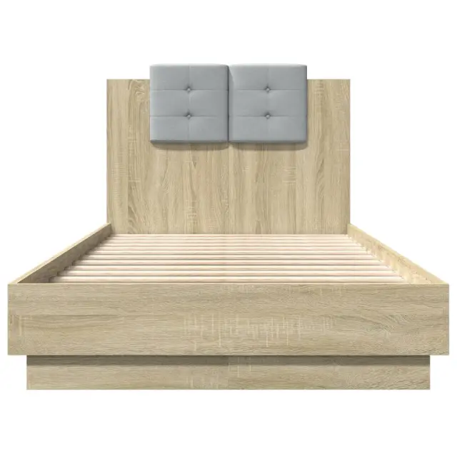 Zagotovite si boljši spanec s tem posteljnim okvirjem z vzglavjem! Je prijeten dodatek za vsako spalnico. Vzdržljiv material: Inženirski les se ponaša z izjemno kakovostjo, gladko površino ter močjo, stabilnostjo in odpornostjo na vlago.Letvice iz vezanega lesa: Letvice iz vezanega lesa omogočajo dobro porazdelitev teže in zagotavljajo, da vzmetnica ostane na mestu ob vsakem zasuku in obračanju med spanjem.Odlična podpora: Vzglavna stranica je napolnjena s peno za izjemno mehkobo in optimalno udobje ter zagotavlja odlično podporo hrbtu, ko sedite v postelji in berete ali gledate televizijo. Dobro je vedeti:Vzmetnica ni priložena tej postelji. Ponujamo različno izbiro ležišč. V naši trgovini si lahko ogledate ustrezne vzmetnice.Barva postelje: Sonoma hrastBarva blazine za vzglavje: Svetlo sivaMaterial posteljnega okvirja: Inženirski les, tkanina (100 % poliester)Material letvic: Vezan lesMaterial polnila blazine za vzglavje: PenaCelotne dimenzije: 194,5 x 93 x 84 cm (D x Š x V)Velikost primerne vzmetnice: 90 x 190 cm (Š x D) (vzmetnica ni priložena)Velikost blazine za vzglavje: 32 x 32 cm (D x Š)Potrebno sestavljanje: Da
