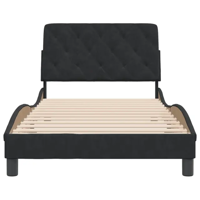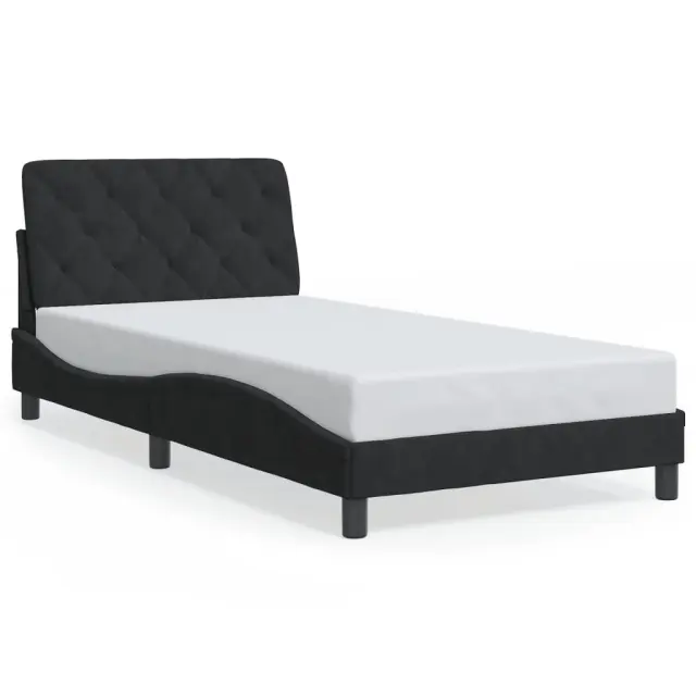 Zagotovite si boljši spanec s tem posteljnim okvirjem z vzglavjem! Je prijeten dodatek za vsako spalnico. Mehak žamet: Žamet je mehka in udobna tkanina, ki je prijetna do kože.Letvice iz vezanega lesa: Letvice iz vezanega lesa omogočajo dobro porazdelitev teže in zagotavljajo, da vzmetnica ostane na mestu ob vsakem zasuku in obračanju med spanjem.Odlična podpora: Vzglavna stranica je napolnjena s peno za izjemno mehkobo in optimalno udobje ter zagotavlja odlično podporo hrbtu, ko sedite v postelji in berete ali gledate televizijo.Priročna zasnova: Vzglavna stranica ima zadrgo za preprosto namestitev, pripenjala na zadnji strani pa se lahko uporabijo za pritrditev LED lučk.Valovita stranica: Valoviti videz posteljnega okvirja je eleganten in prefinjen. Dekorju v vašem domu dodaja sodoben in eleganten pridih ter tako postane osrednja točka spalnice. Dobro je vedeti:Vzmetnica ni priložena tej postelji. Ponujamo različno izbiro ležišč. V naši trgovini si lahko ogledate ustrezne vzmetnice.Posteljni okvir z vzglavjem:Barva: ČrnaMaterial: Žamet (100 % poliester), kovina, trdna borovina, vezan les, inženirski lesCelotne dimenzije: 218 x 105 x 74,5 cm (D x Š x V)Velikost primerne vzmetnice: 100 x 200 cm (Š x D) (vzmetnica ni priložena)Oblazinjeno vzglavje:Barva: ČrnaMaterial: Žamet (100 % poliester)Material polnila: PenaDimenzije: 102 x 6 x 48 cm (D x Š x V)Širina primerne vzmetnice: 100 cmPotrebno sestavljanje: DaPaket vsebuje:1 x Posteljni okvir z vzglavjem1 x Oblazinjeno vzglavje