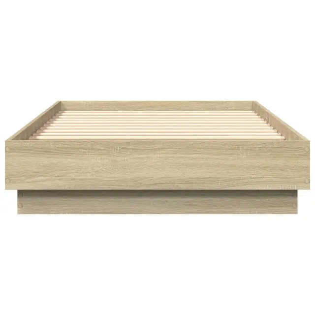 Zagotovite si boljši spanec s tem posteljnim okvirjem z LED lučkami! Je prijeten dodatek za vsako spalnico. Vzdržljiv material: Inženirski les se ponaša z izjemno kakovostjo, gladko površino ter močjo, stabilnostjo in odpornostjo na vlago.RGB LED luči: Posteljni okvir je opremljen z živahnimi RGB LED lučkami. Z različnimi prilagodljivimi meniji lahko brez težav spreminjate barvo luči in celo nastavite njihovo samodejno prilagajanje. Te LED lučke poudarjajo sodoben videz posteljnega okvirja in povečujejo njegovo modno privlačnost.Trdne letvice: Letvice iz vezanega lesa omogočajo dobro porazdelitev teže in zagotavljajo, da vzmetnica ostane na mestu ob vsakem zasuku in obračanju med spanjem. Dobro je vedeti:Vzmetnica ni priložena tej postelji. Ponujamo različno izbiro ležišč. V naši trgovini si lahko ogledate ustrezne vzmetnice.Izdelek ima priključek USB, ki zahteva certificiran vir napajanja 5 V USB (ni priložen).Barva: Sonoma hrastMaterial posteljnega okvirja: Inženirski lesMaterial letvic: Vezan lesCelotne dimenzije: 193 x 78 x 23 cm (D x Š x V)Velikost primerne vzmetnice: 75 x 190 cm (Š x D) (vzmetnica ni priložena)Potrebno sestavljanje: Da Tega izdelka ne uporabljajte, če je katera koli komponenta polomljena, strgana ali manjka. Ta izdelek se napaja z DC 5 V, vendar certificirani 5 V vir napajanja USB ni priložen. Višja napetost lahko povzroči pregrevanje in poškoduje napravo ter povzroči potencialno nevarnost pregrevanja in požara.