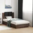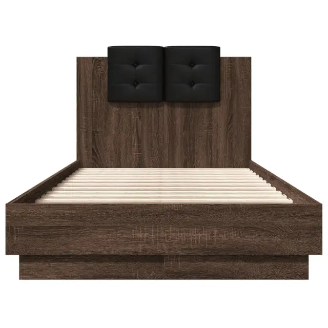 Zagotovite si boljši spanec s tem posteljnim okvirjem z vzglavjem! Je prijeten dodatek za vsako spalnico. Vzdržljiv material: Inženirski les se ponaša z izjemno kakovostjo, gladko površino ter močjo, stabilnostjo in odpornostjo na vlago.Letvice iz vezanega lesa: Letvice iz vezanega lesa omogočajo dobro porazdelitev teže in zagotavljajo, da vzmetnica ostane na mestu ob vsakem zasuku in obračanju med spanjem.Odlična podpora: Vzglavna stranica je napolnjena s peno za izjemno mehkobo in optimalno udobje ter zagotavlja odlično podporo hrbtu, ko sedite v postelji in berete ali gledate televizijo. Dobro je vedeti:Vzmetnica ni priložena tej postelji. Ponujamo različno izbiro ležišč. V naši trgovini si lahko ogledate ustrezne vzmetnice.Barva postelje: Rjav hrastBarva blazine za vzglavje: ČrnaMaterial posteljnega okvirja: Inženirski les, umetno usnje (60 % poliuretan, 30 % poliester, 10 % bombaž)Material letvic: Vezan lesMaterial polnila blazine za vzglavje: PenaCelotne dimenzije: 194,5 x 93 x 84 cm (D x Š x V)Velikost primerne vzmetnice: 90 x 190 cm (Š x D) (vzmetnica ni priložena)Velikost blazine za vzglavje: 32 x 32 cm (D x Š)Potrebno sestavljanje: Da