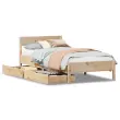 Zagotovite si boljši spanec s tem posteljnim okvirjem! Je prijeten dodatek za vsako spalnico. Stabilen in dolgotrajen okvir: Trdna borovina je znana po svoji trdnosti in trajnosti. Ravni vzorci in značilni vozli prispevajo k njenemu rustikalnemu čaru.Podnožje z letvami za optimalno podporo: Za podporo in zračnost ležišča je posteljni okvir opremljen z letvenim dnom.Vsestransko vzglavje: Ta posteljni okvir je opremljen z vzglavjem, ki zagotavlja odlično oporo hrbtu, ko sedite v postelji in berete ali gledate televizijo, hkrati pa služi tudi kot dekorativni element.Popolnoma izkoriščen prostor: Ta posteljni okvir ima spodaj dva predala, ki omogočata shranjevanje predmetov, kot so dodatna posteljnina, sezonska oblačila in igrače.Preprosto manevriranje: Ta predal za shranjevanje pod posteljo ima štiri kolesa, ki zagotavljajo gladko in lahkotno manevriranje pri drsenju pod posteljo in izpod nje. Dobro je vedeti:Vzmetnica ni priložena tej postelji. Ponujamo različno izbiro ležišč. V naši trgovini si lahko ogledate ustrezne vzmetnice.Potrebno sestavljanje: DaPosteljni okvir z vzglavjem:Material: Trdna borovina (neobdelana)Material letvic: Vezan lesDimenzije: 195,5 x 80,5 x 71,5 cm (D x Š x V)Velikost primerne vzmetnice: 75 x 190 cm (Š x D) (vzmetnica ni priložena)Predal:Material: Trdna borovina (neobdelana)Zunanje dimenzije: 90 x 55 x 16 cm (Š x G x V)Notranje dimenzije: 81,5 x 52,5 x 10 cm (Š x G x V)Maks. nosilnost (vsaka): 20 kgS štirimi kolesi Paket vsebuje:1 x Posteljni okvir z vzglavjem2 x Predal