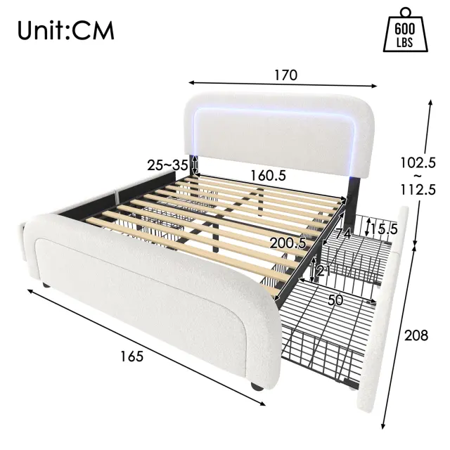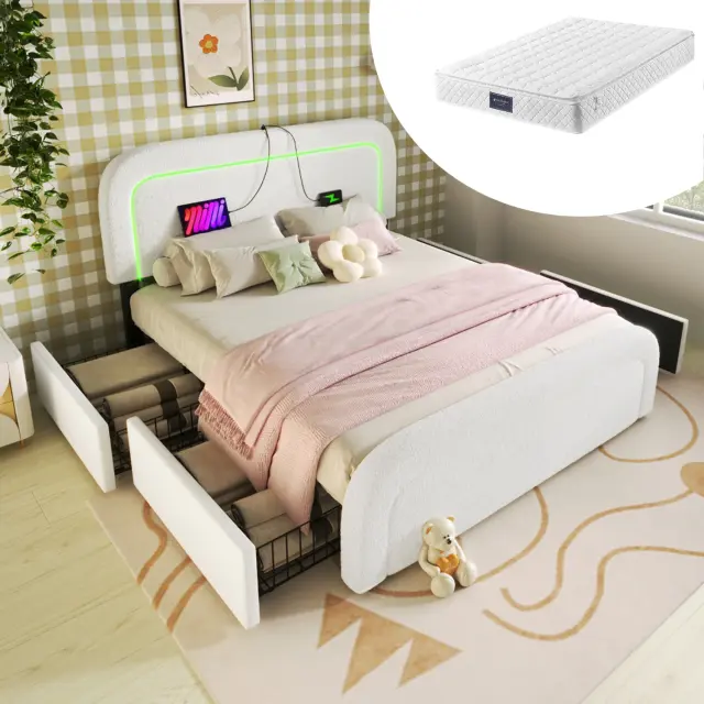 Ta posteljni okvir iz belega šerpa materiala (160 x 200 cm) ima polnilni priključek USB-C, LED osvetlitev in štiri predale. 7-conska vzmetnica iz hladne pene z vzmetmi 720 zagotavlja optimalno udobje in oporo.