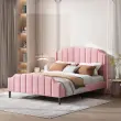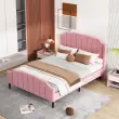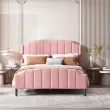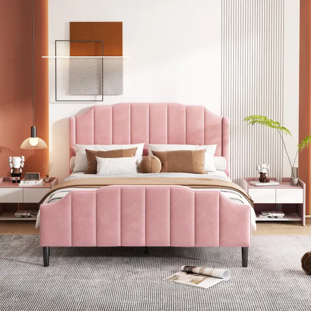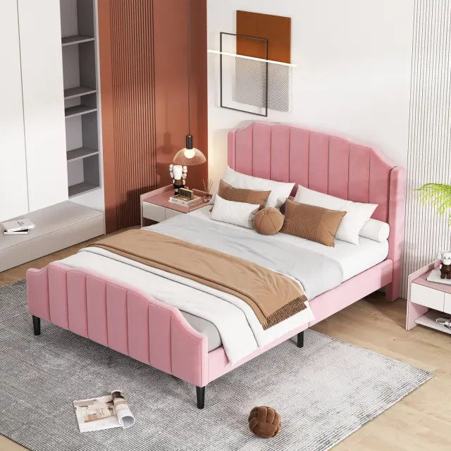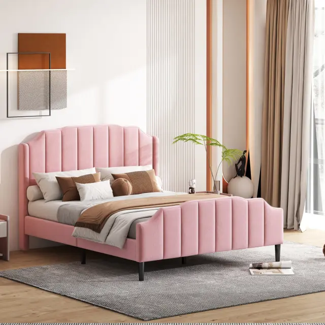 Posteljni okvir z oblazinjenjem iz roza žameta z vzglavjem in vznožjem, 140 x 200 cm.