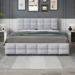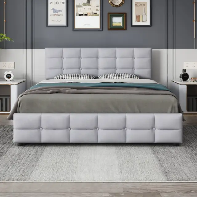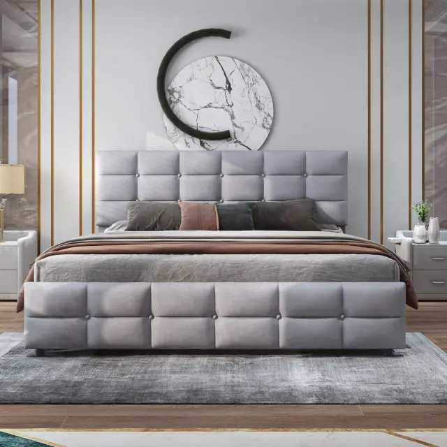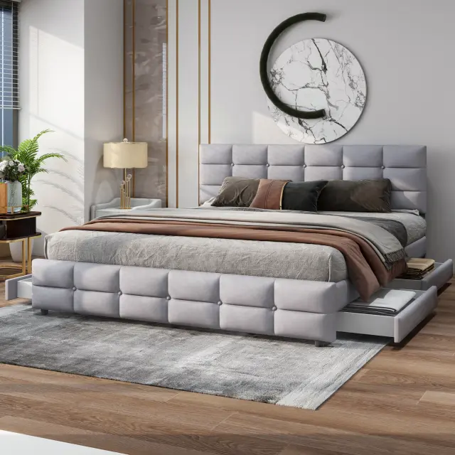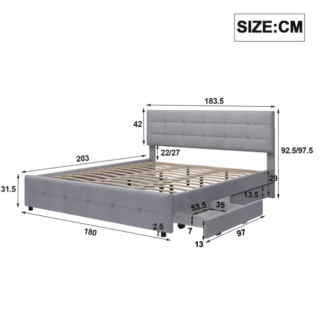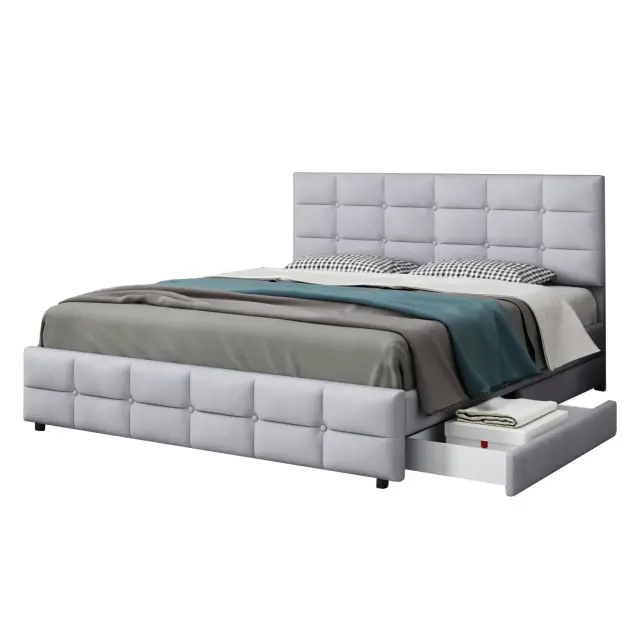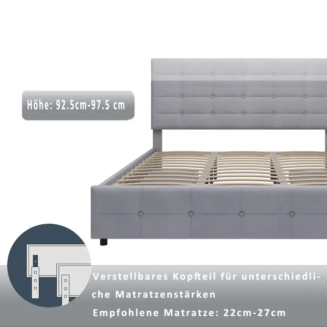 Posteljni okvir z oblazinjenjem iz sivega žameta 180x200 cm s 4 predali, letvenim dnom in vzglavjem (vzmetnica ni vključena)