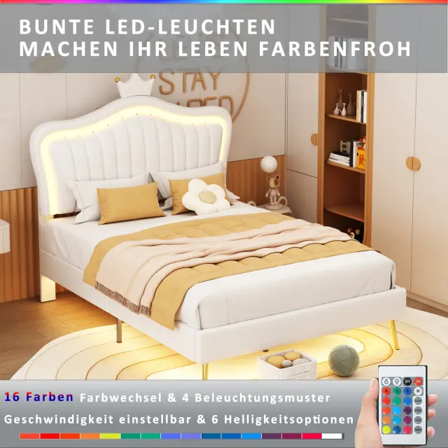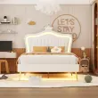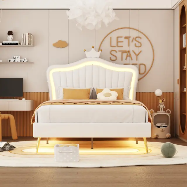 Posteljni okvir za otroško posteljico z oblazinjenjem iz belega umetnega usnja z vzglavjem v obliki krone, LED lučmi in letvenim podnožjem (90x200